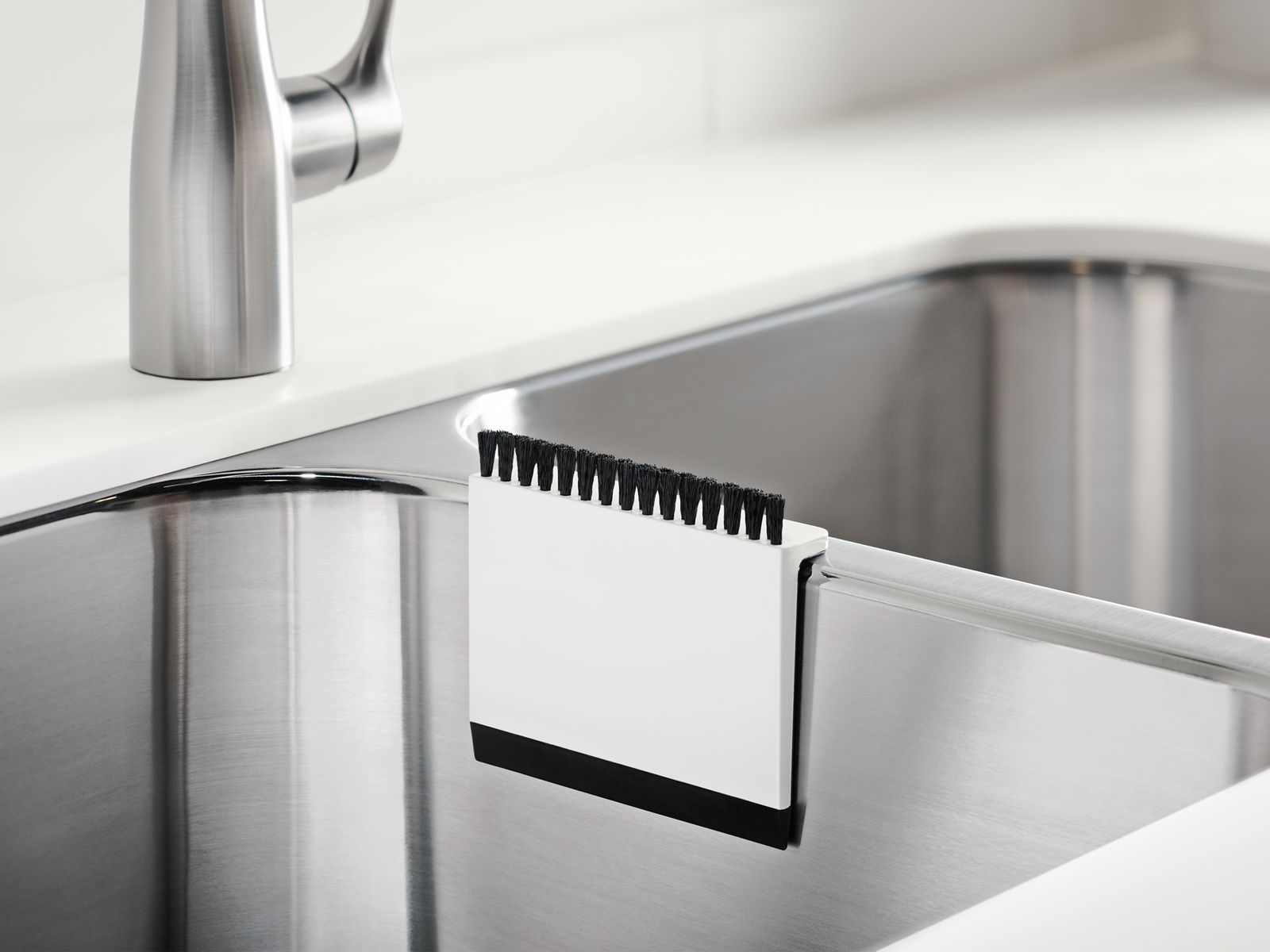 Keep your kitchen countertop sparkling clean while reducing paper towel usage. This accessory includes two cleaning tools in one: a squeegee on one side for wiping wet messes into the sink, and nylon bristles on the other side for sweeping up dry messes. The ergonomic design is weighted for balance and is comfortable to hold.