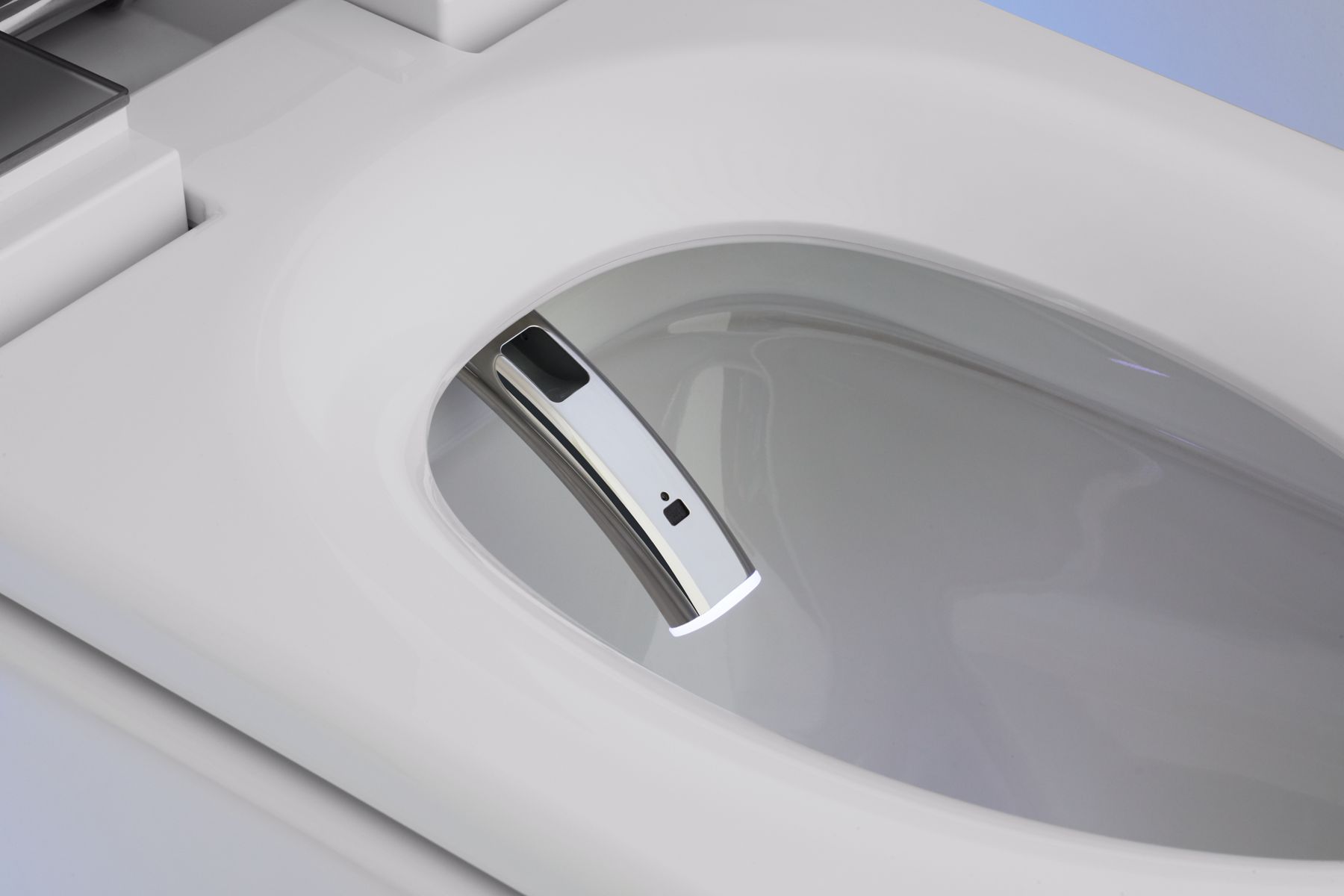 - Compact, streamlined one-piece smart toilet with integrated personal cleansing