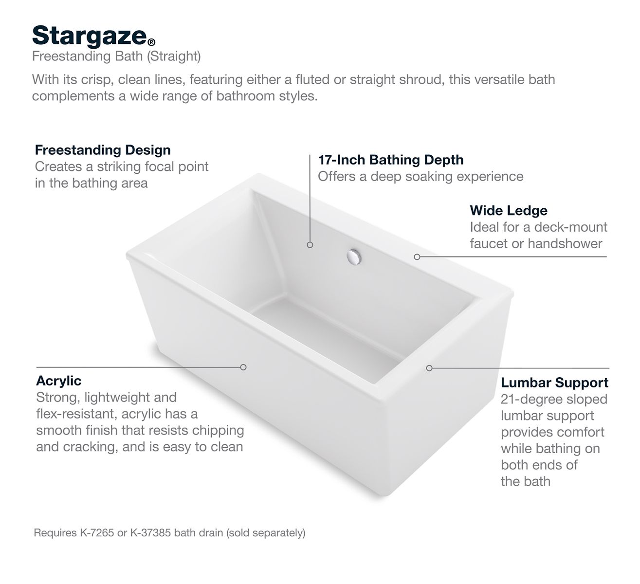 Create a luxurious centerpiece for your bathing area with the Stargaze freestanding bath. Made for deep soaking and relaxation, the ergonomic design provides lumbar support at both ends, so you can stretch out in full comfort. With its crisp, clean lines and straight shroud, this versatile bath complements a wide range of bathroom styles and offers easy three-step installation.