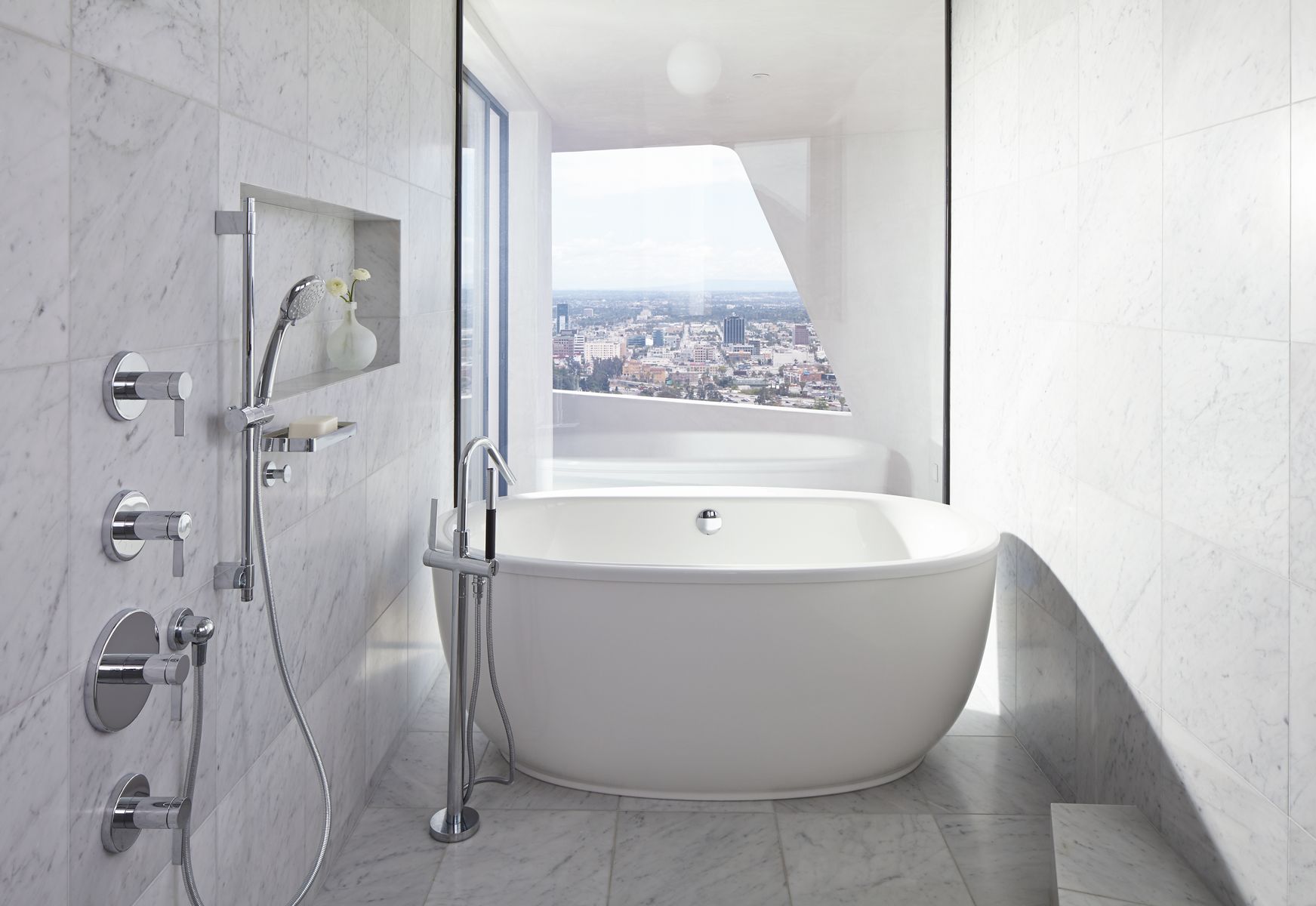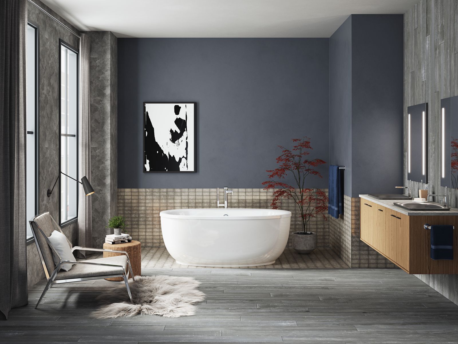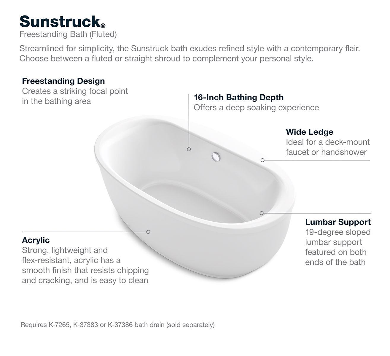 Surround yourself with tranquility and comfort in the Sunstruck freestanding bath. Combining luxury with practicality, the oval, ergonomic design conforms to and supports your body as you stretch out and enjoy a deep, relaxing soak. With its gracefully shaped lines and fluted shroud, this versatile bath complements a wide range of bathroom styles and offers easy three-step installation.