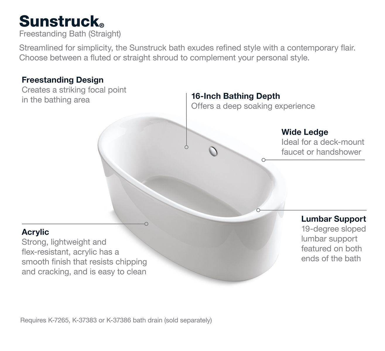 Surround yourself with tranquility and comfort in the Sunstruck freestanding bath. Combining luxury with practicality, the oval, ergonomic design conforms to and supports your body as you stretch out and enjoy a deep, relaxing soak. With its gracefully shaped lines and straight shroud, this versatile bath complements a wide range of bathroom styles and offers easy three-step installation.