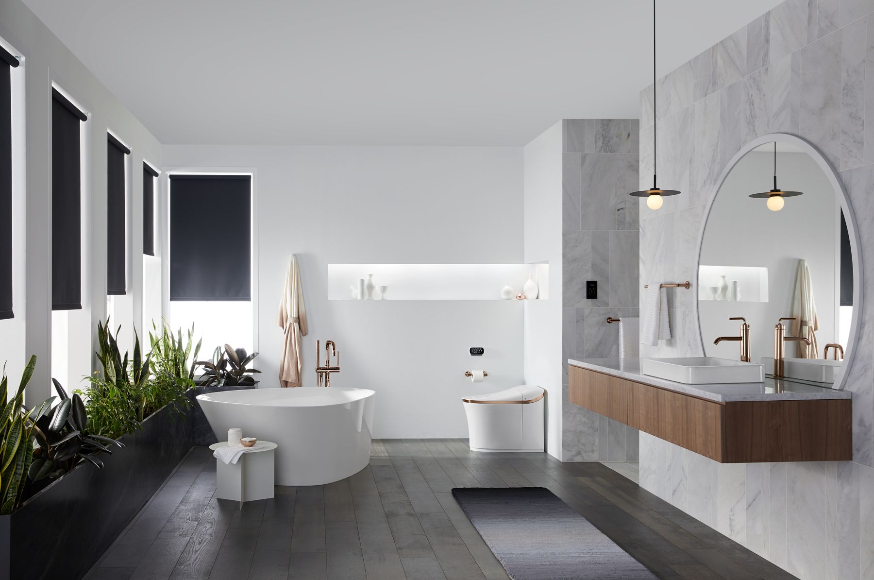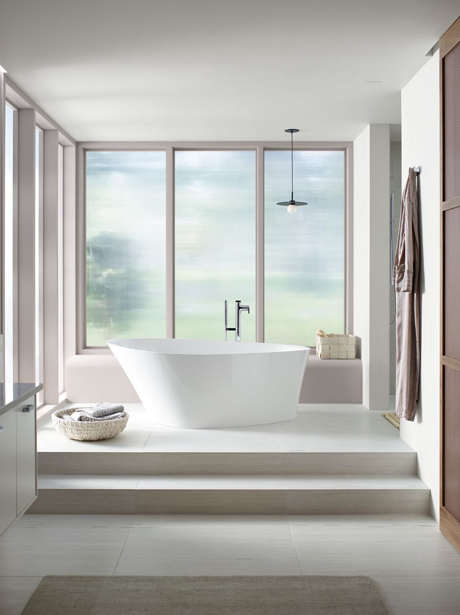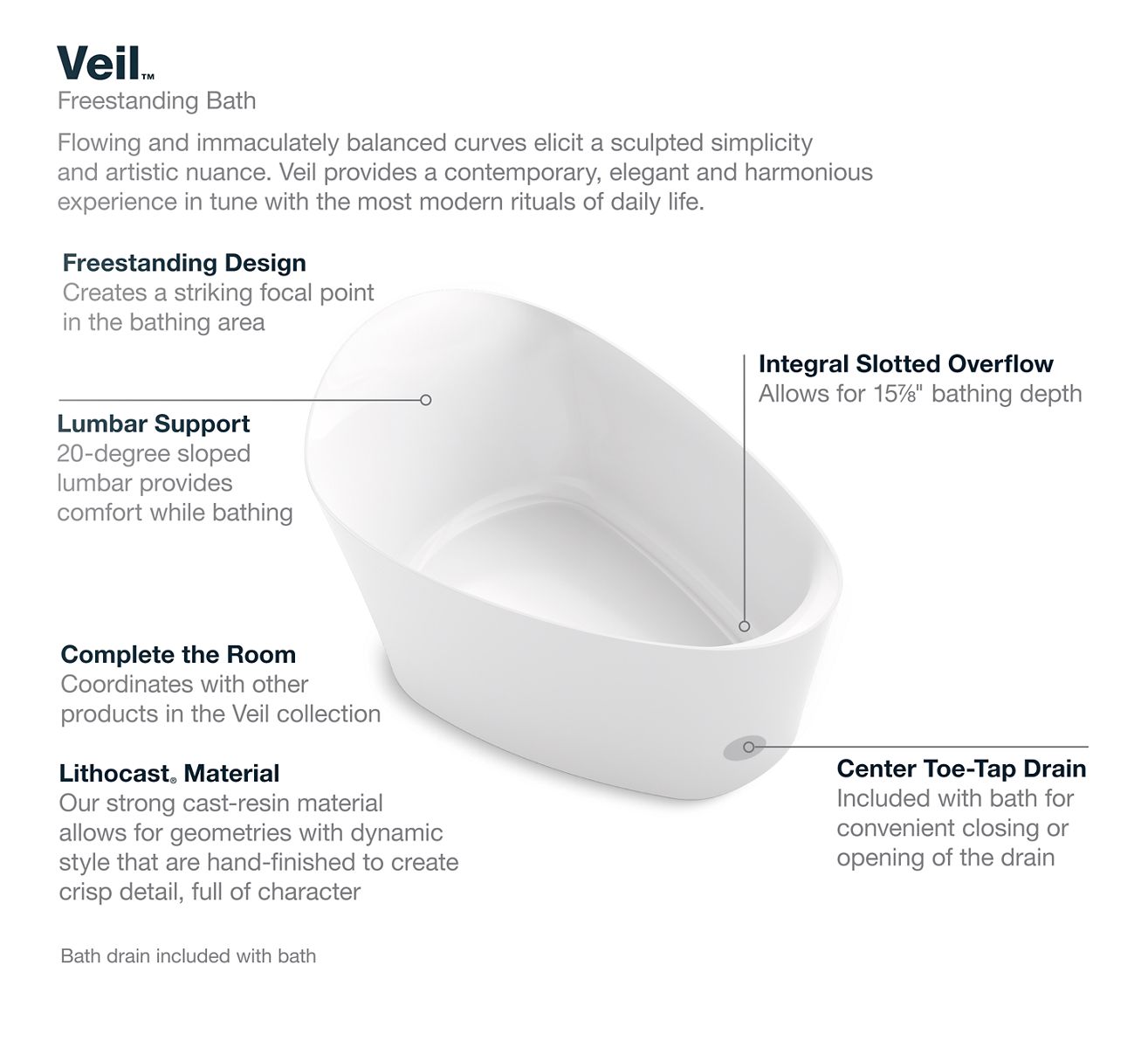 Veil's flowing and immaculately balanced curves evoke a sculpted simplicity in tune with contemporary style. This Veil freestanding bath offers a luxuriously deep bathing experience with supportive contours that cradle your body. KOHLER Lithocast® cast resin material allows for geometries with dynamic style and crisp, hand-finished detail rich with character. KOHLER Lithocast® Gloss cast resin is lightweight and easy to clean, with a high-gloss finish.