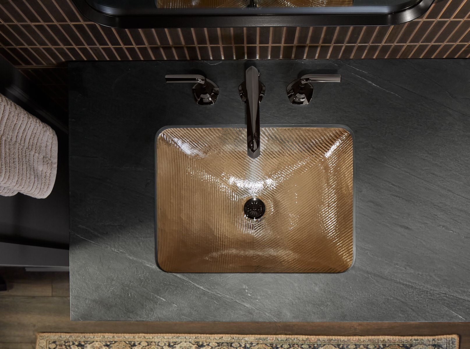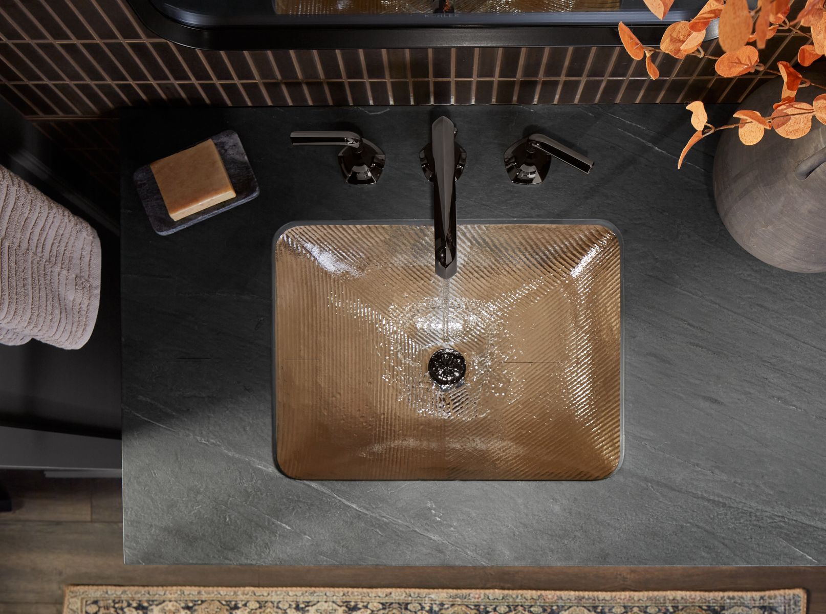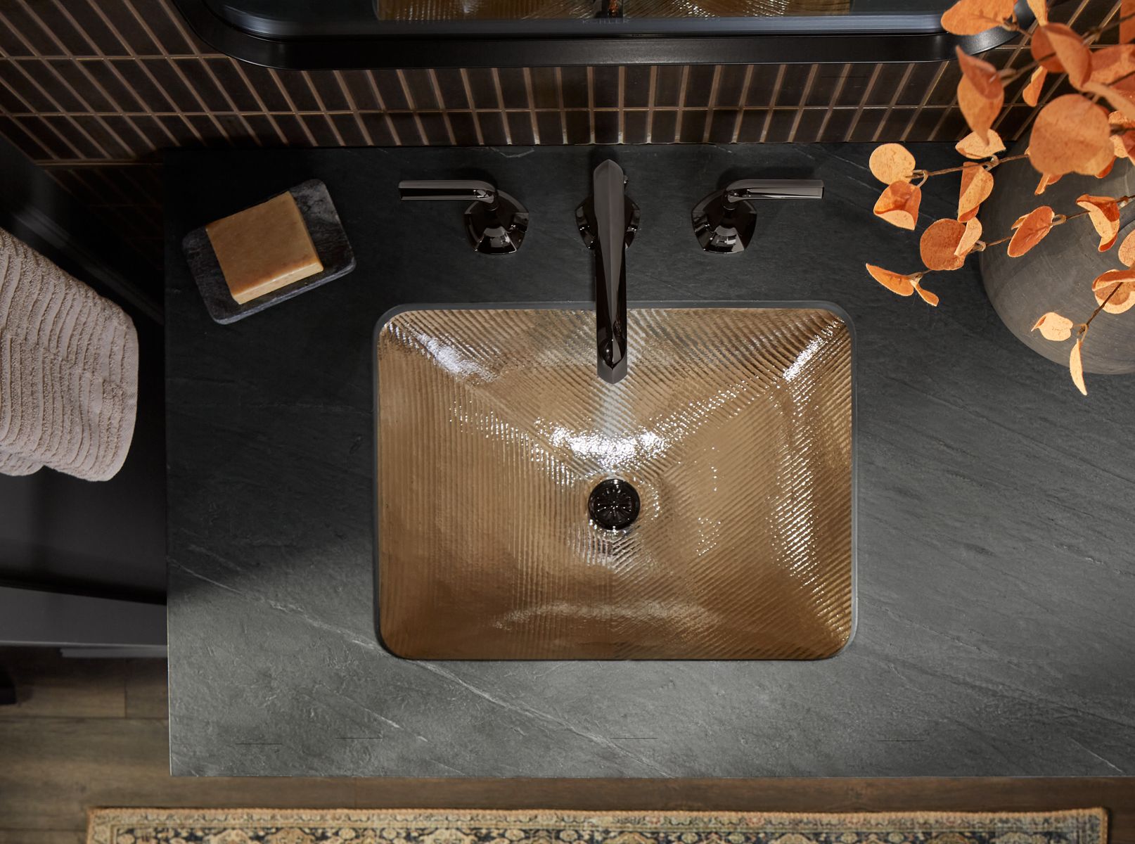 The Yepsen glass undermount bathroom sink combines a linear pattern with angled seams, creating a Y design across the exterior wall of this rounded-rectangular basin. Like ripples in a pool, the sink’s distinctive ridges draw the eye to the core of this artisan-crafted centerpiece, while also concealing items stored beneath it. Artistically intriguing and functionally fulfilling, this elegant undermount sink was designed for the bathroom spotlight.