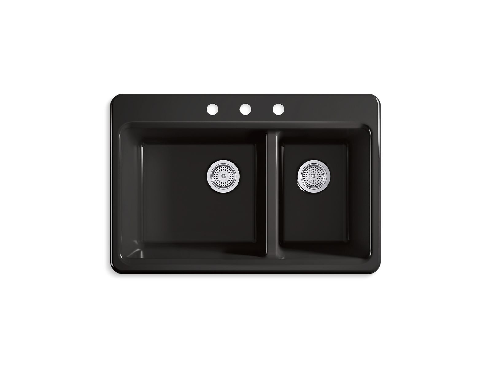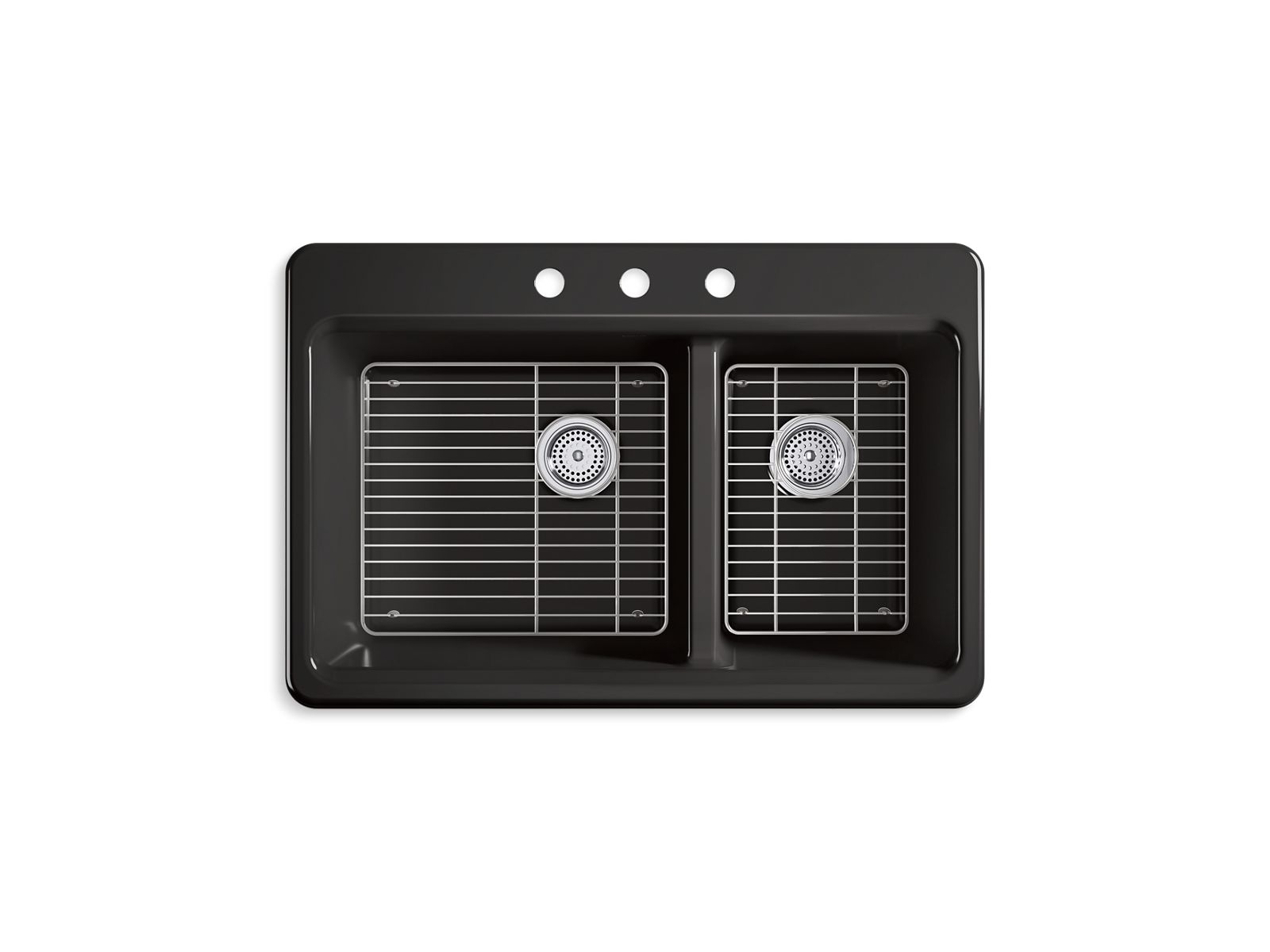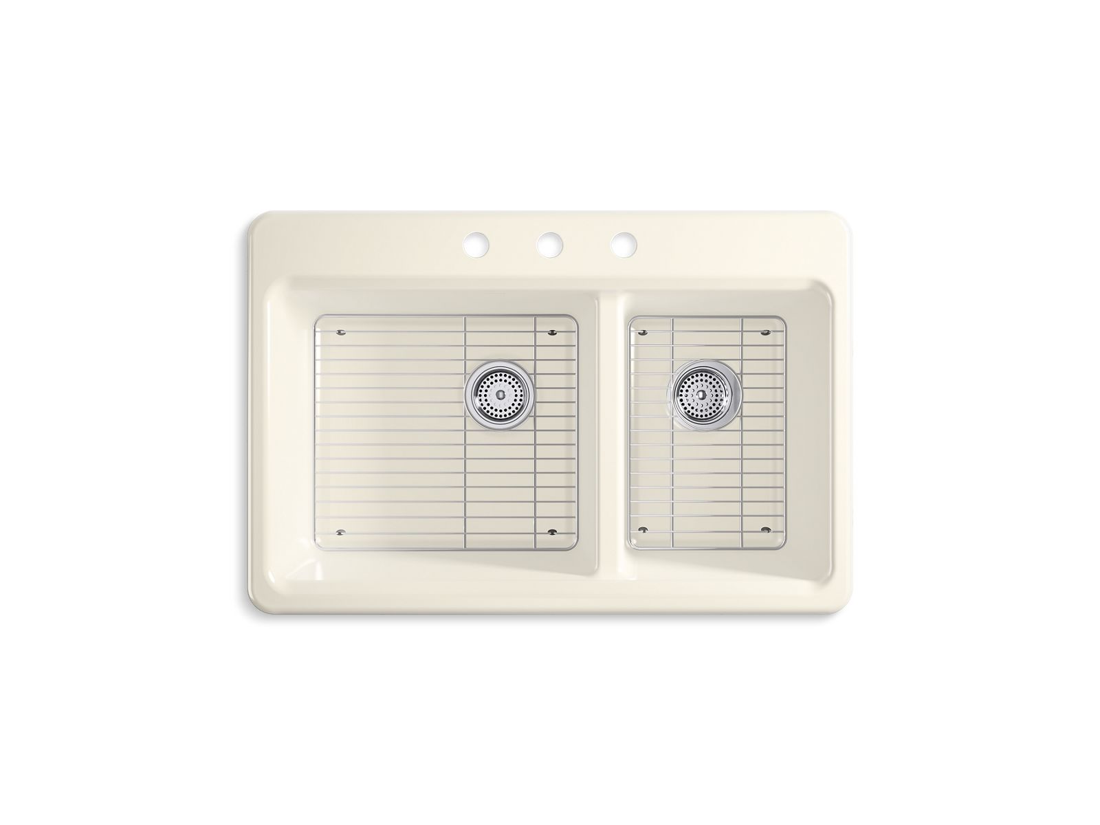 The understated beauty of this KOHLER Riverby sink makes it an elegant and versatile addition to the kitchen. The offset bowls allow you to keep clean and dirty dishes separate, while a sloped base minimizes water pooling. Crafted from enameled cast iron, this sink resists chipping, cracking, and burning for years of beauty and reliable performance. This Riverby sink includes two stainless steel sink racks.