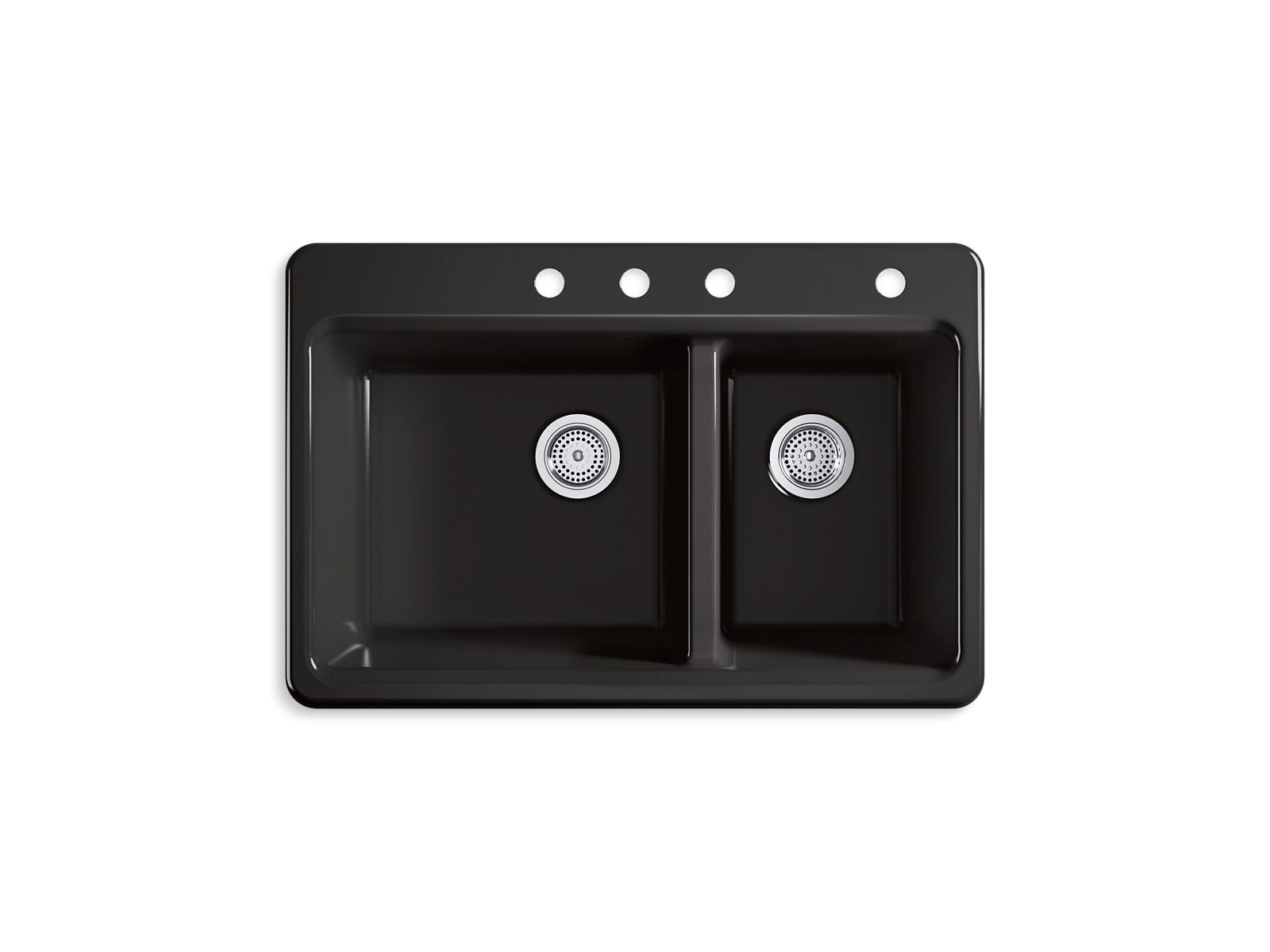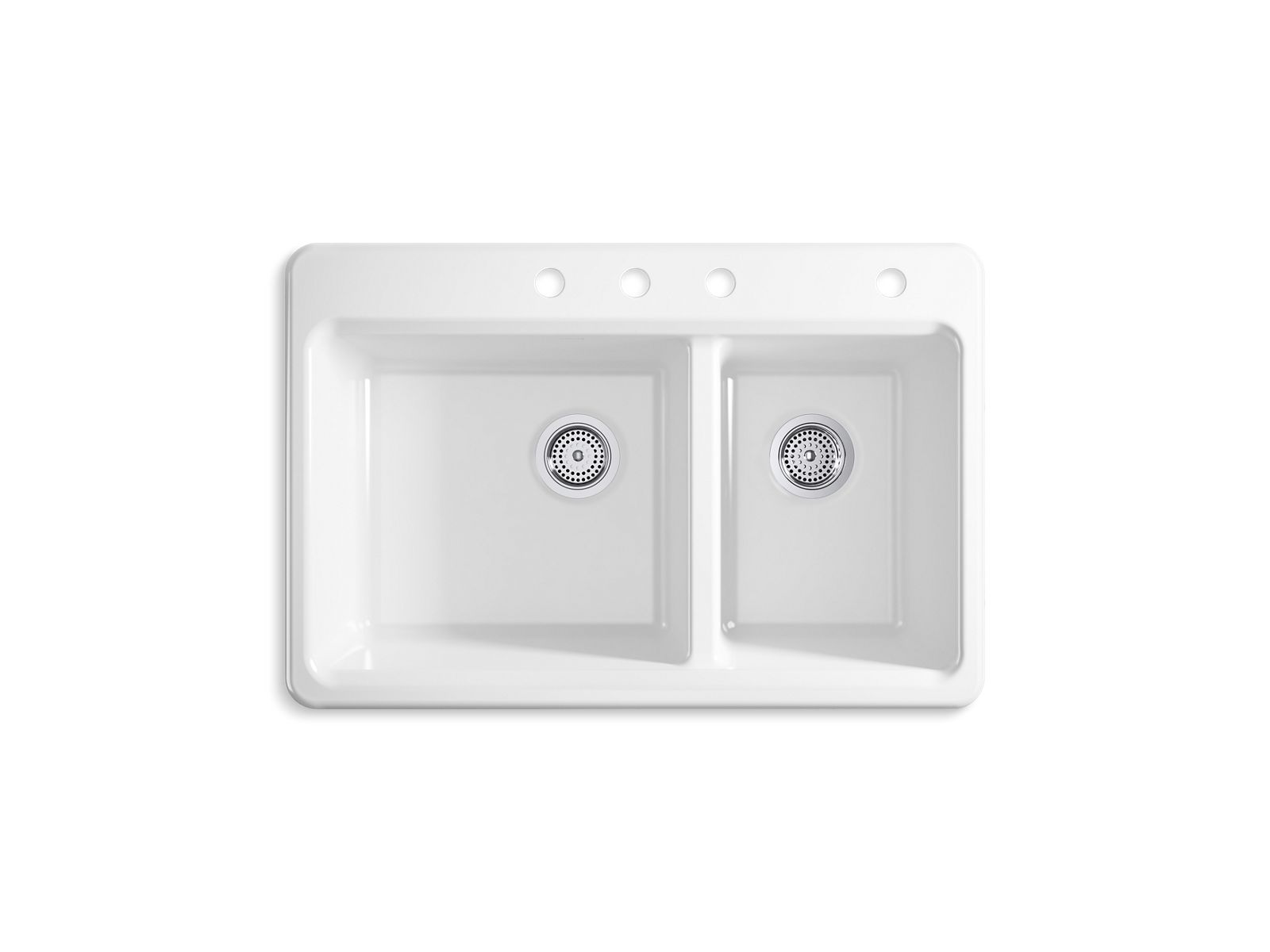 The understated beauty of this KOHLER Riverby sink makes it an elegant and versatile addition to the kitchen. The offset bowls allow you to keep clean and dirty dishes separate, while a sloped base minimizes water pooling. Crafted from enameled cast iron, this sink resists chipping, cracking, and burning for years of beauty and reliable performance. This Riverby sink includes two stainless steel sink racks.