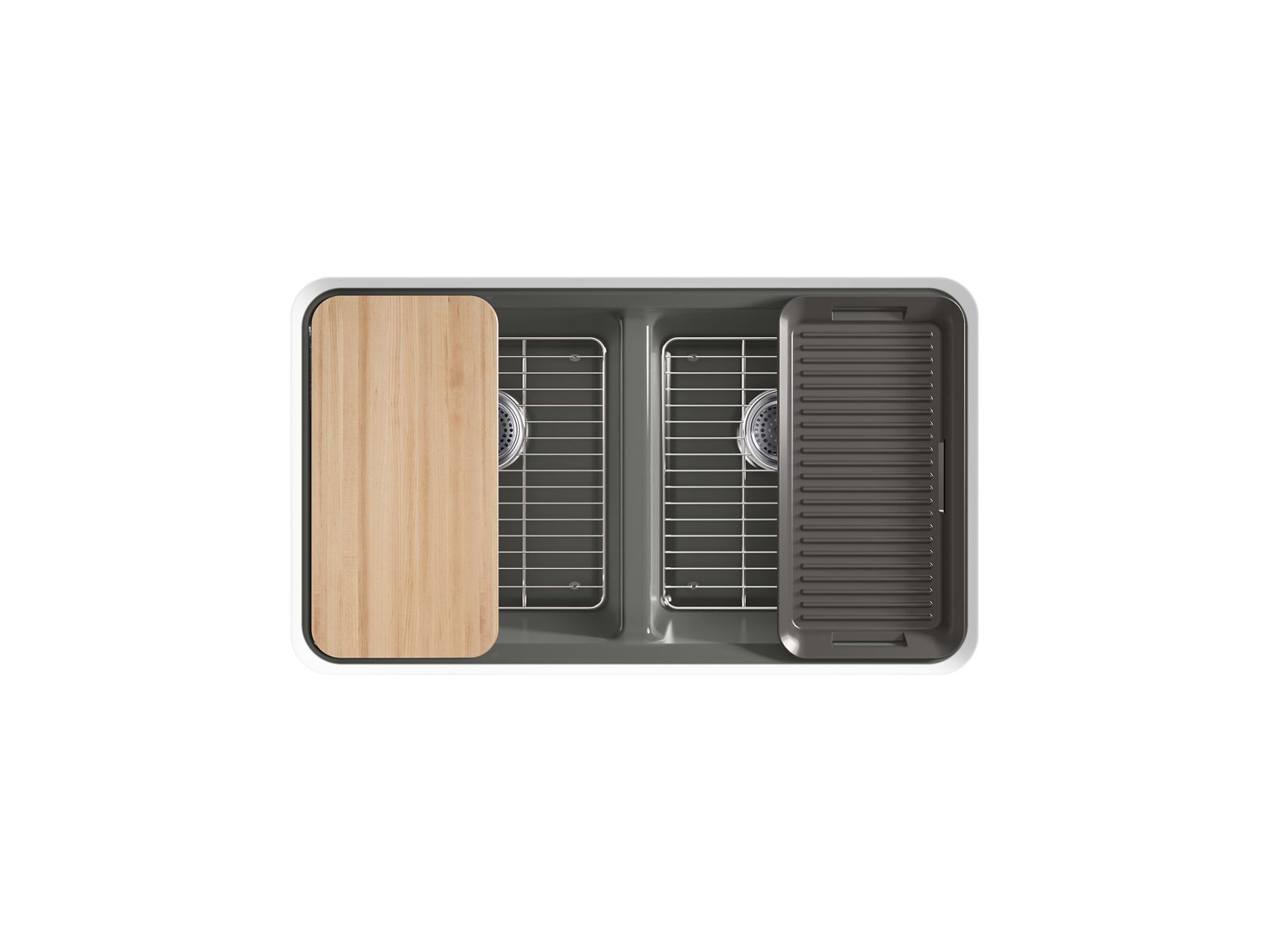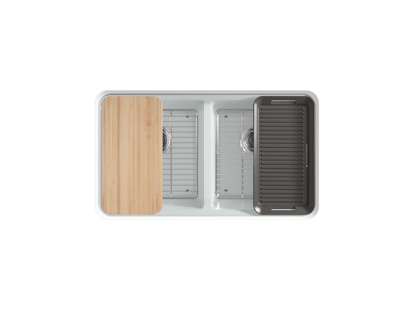 The understated beauty of this Riverby undermount workstation kitchen sink makes it an elegant and versatile addition to the kitchen. Large double-equal bowls provide ample space to soak and wash cookware, while a sloped base to offset drains minimizes water pooling. Crafted from enameled cast iron, this sink resists chipping, cracking, and burning for years of beauty and reliable performance. It comes with a wood cutting board, dishwasher-safe drain board, colander/drying rack, soaking bin, and two stainless steel sink racks.