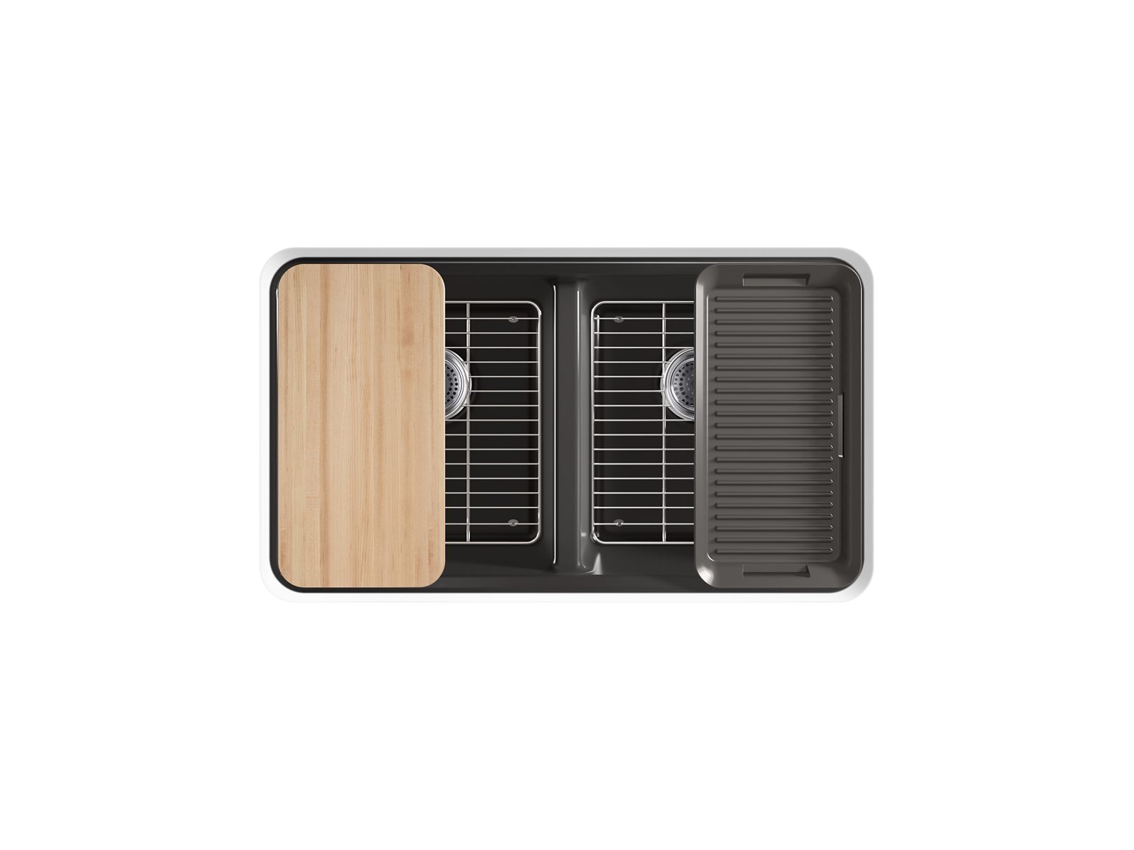 - Included accessories: cutting board, drain board, colander / drying rack, soaking bin with drain, stainless steel bottom sink racks
