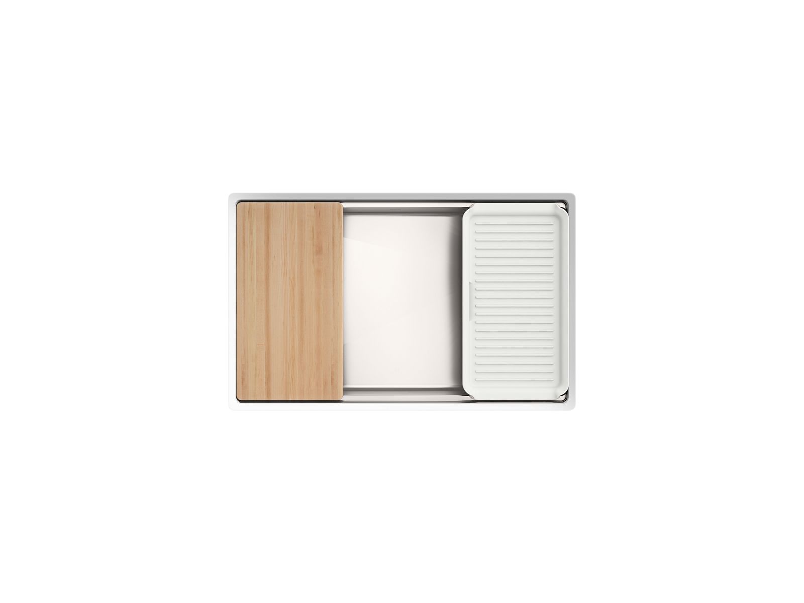 - Included accessories: cutting board, drain board, colander / drying rack, soaking bin with drain, stainless steel bottom sink rack, drain cover