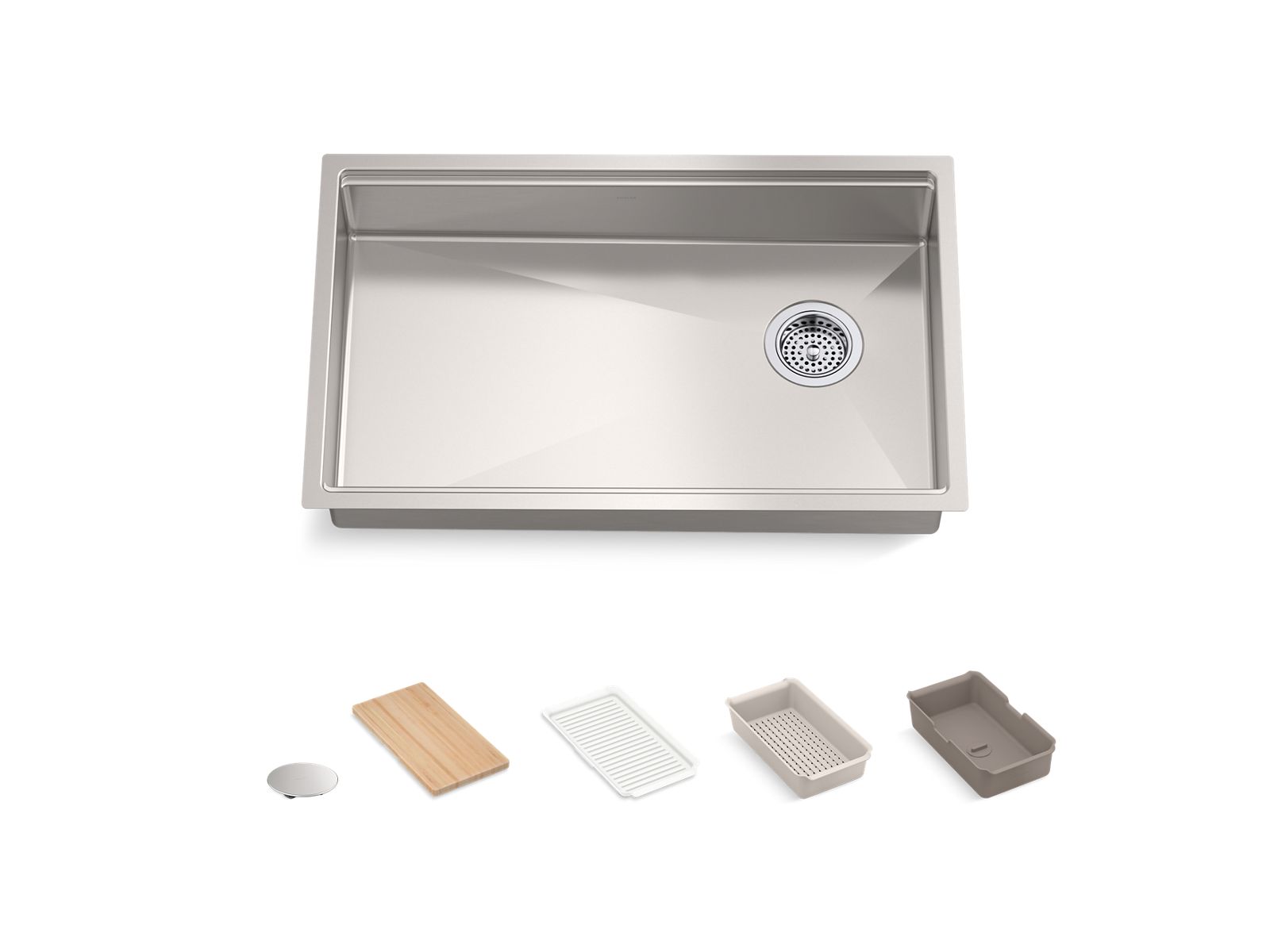 The Strive 29" undermount workstation kitchen sink raises the bar on functionality and professional styling with custom accessories that integrate seamlessly within the bowl's ledge. With an eye toward food preparation as well as cleanup and storage, the included accessories are both thoughtful and practical. Strive is made of thick, premium quality 16-gauge stainless steel with easy-to-clean rounded corners and a sound-absorption system that significantly reduces disposal and dishwashing noise. Its 5-1/2" bowl depth keeps items within easy reach.