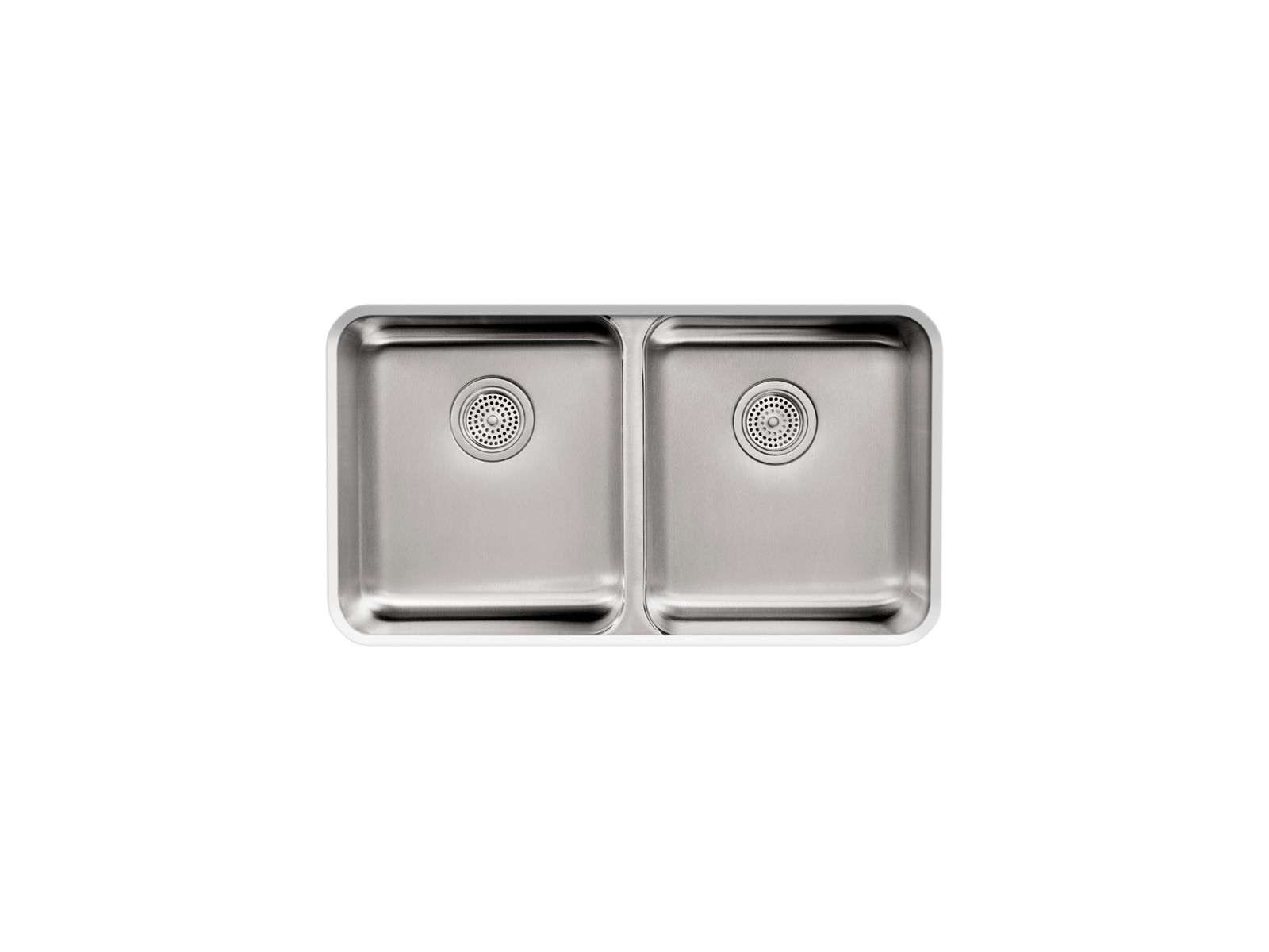 With the professional look of stainless steel and a double basin, this Undertone sink brings sophistication and functionality to your kitchen. An engineered sound-absorption system significantly reduces dishwashing and disposal noise. Two equal-sized bowls make food prep and cleanup easier. A mirror-finish edge adds an elegant accent.