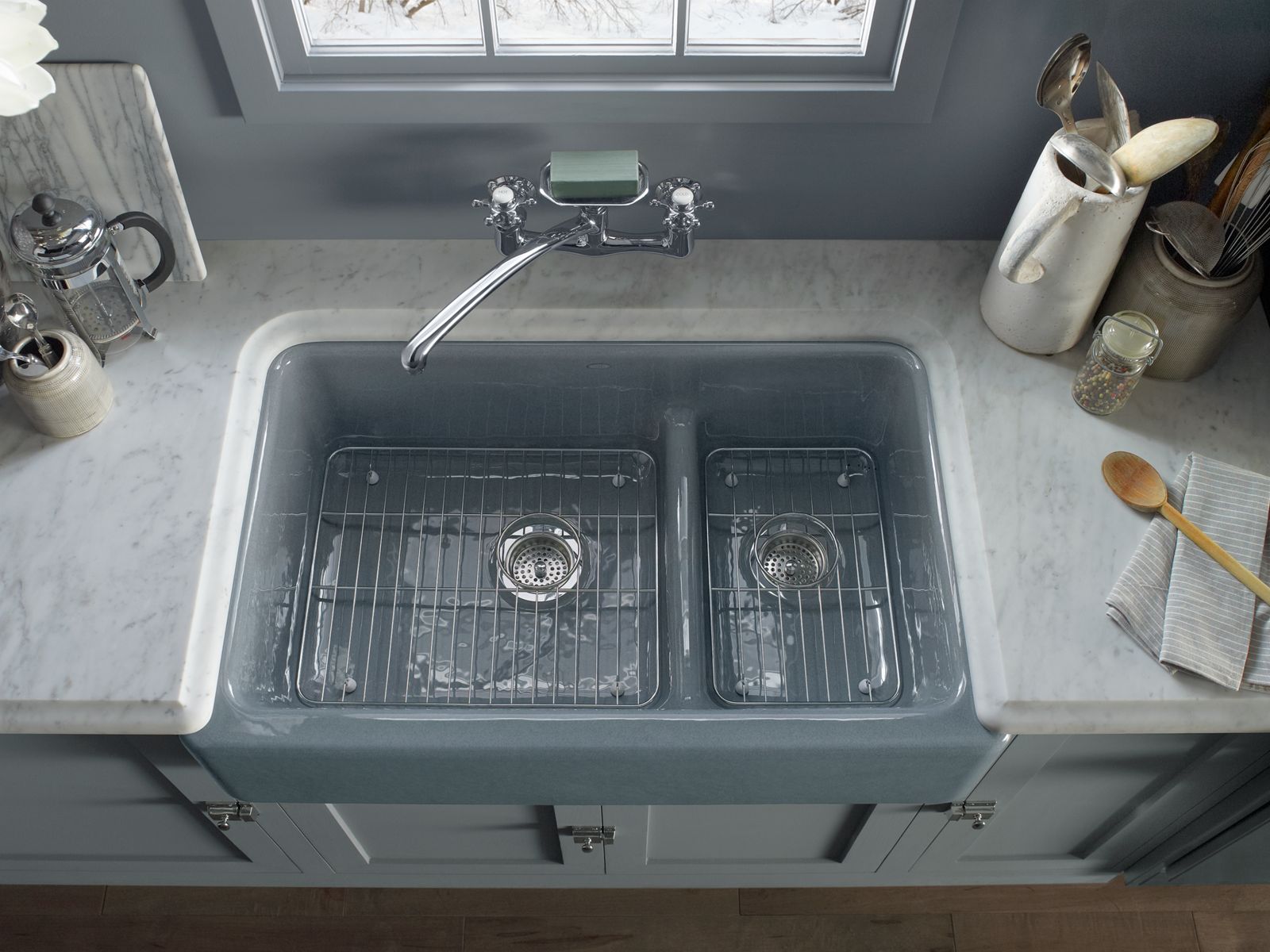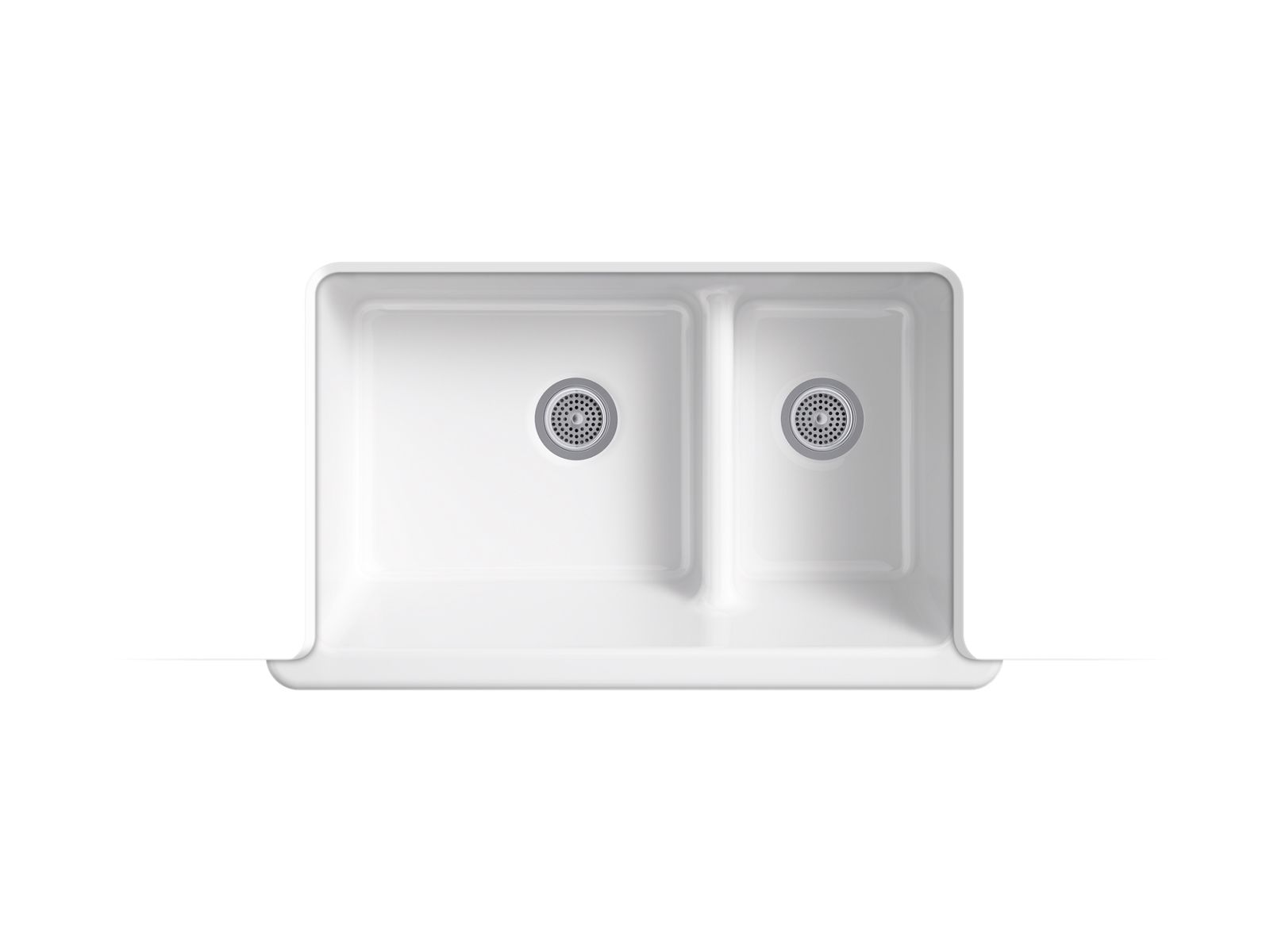 The Whitehaven apron-front kitchen sink features a streamlined and versatile farmhouse style to complement any decor. The Self-Trimming® design requires only a simple rough cut, overlapping the cabinet face for beautiful results. The sink is designed to fit in most standard 36-inch apron-front cabinetry. A low barrier divides the two compartments, making it easy to wash and rinse large items while still keeping the two basins separate. Crafted from enameled cast iron, this sink resists chipping, cracking, or burning for years of beauty and reliable performance.