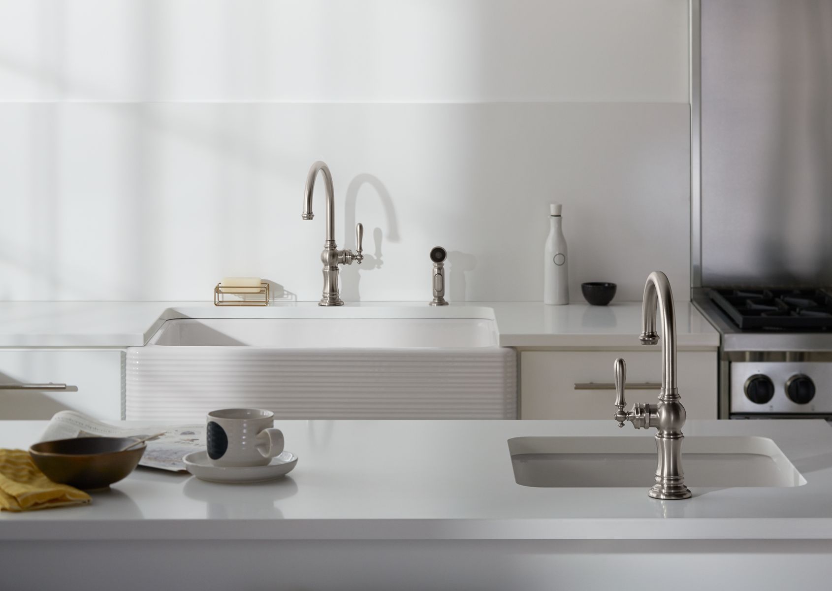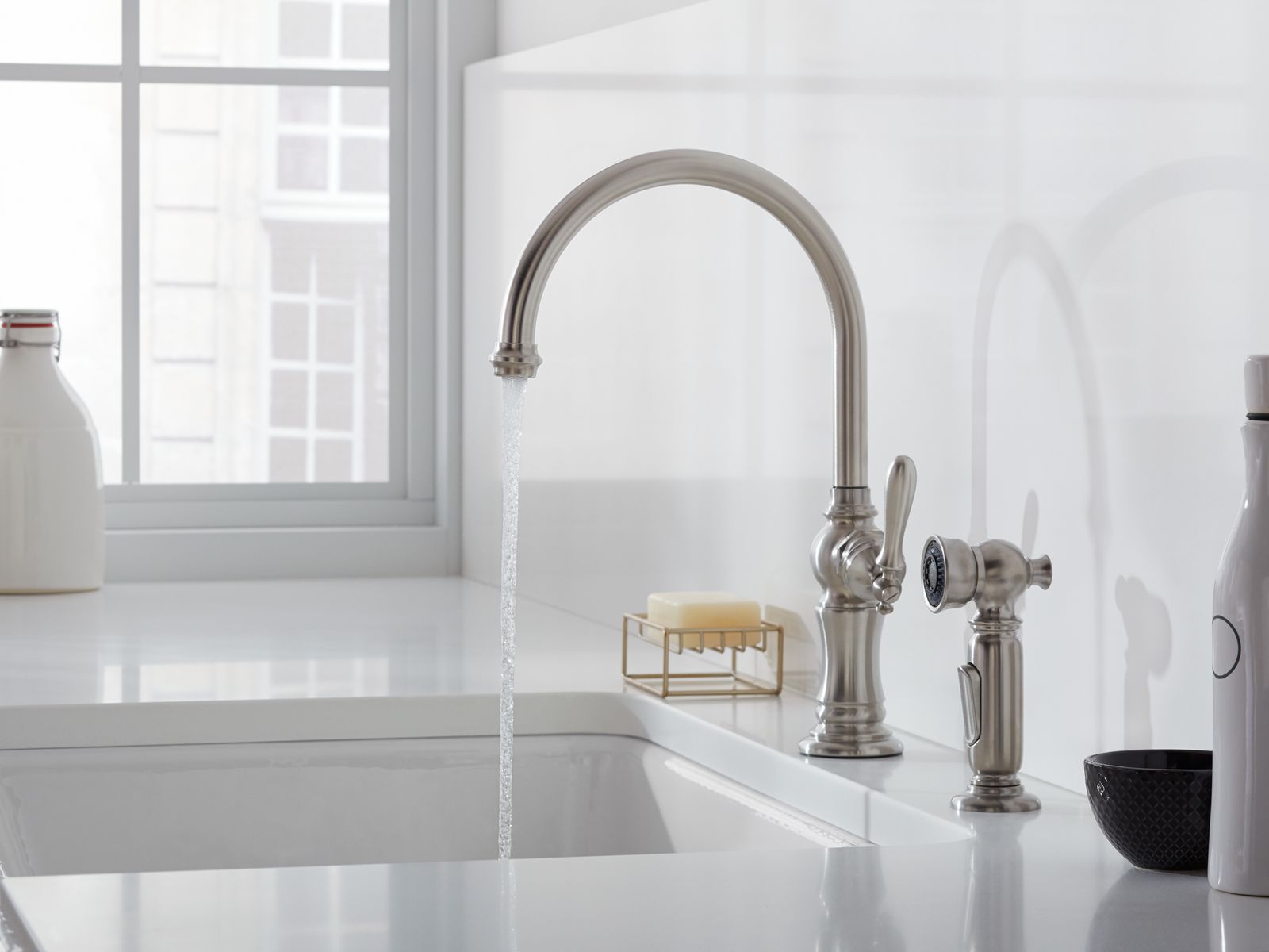 The Artifacts faucet collection brings you classic designs reimagined in fresh new ways for various task areas of the kitchen. This Artifacts kitchen sink faucet displays vintage style with its high-arch swing spout and turned lever handle. The matched two-function sidespray lets you switch between BerrySoft spray for food prep and Sweep spray for cleaning.