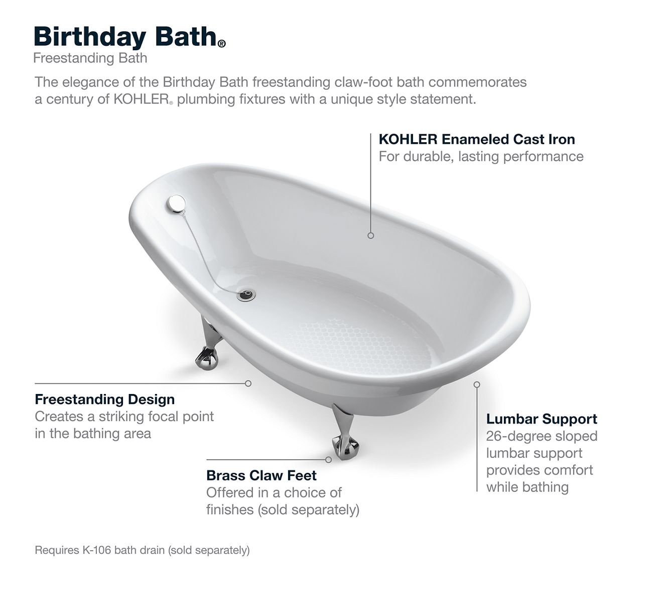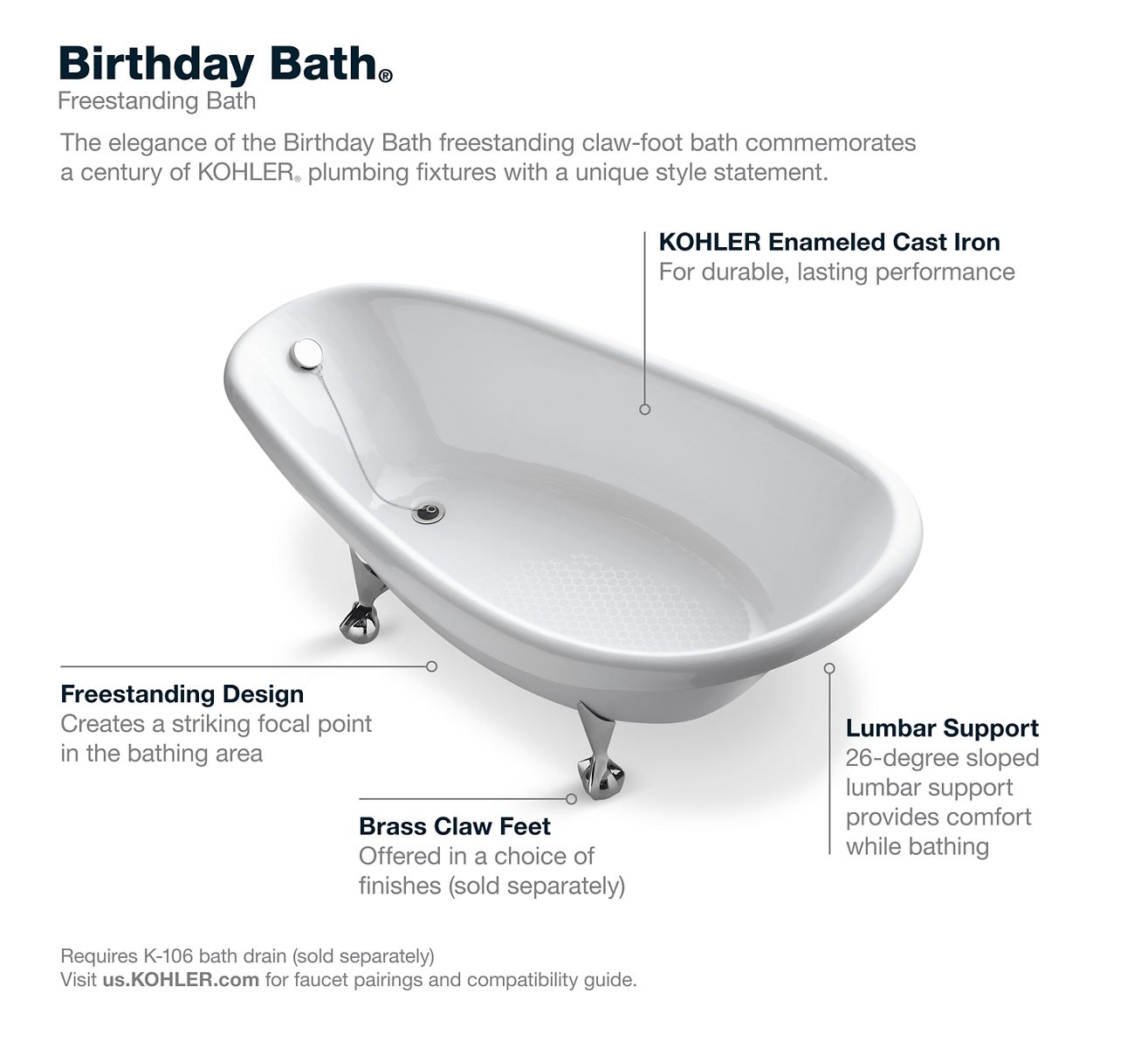 Bring a classic into your bathroom. The elegance of this freestanding clawfoot bath commemorates a century of KOHLER plumbing fixtures. The Birthday Bath makes a unique style statement, while strong cast iron construction ensures beauty and performance for years to come. The 6-foot length offers extra room to bathe in comfort. The exterior ground coat surface is minimally enhanced and painted to capture as much of the raw elements of the cast iron material. Safeguard® slip-resistant surface enhances safety.