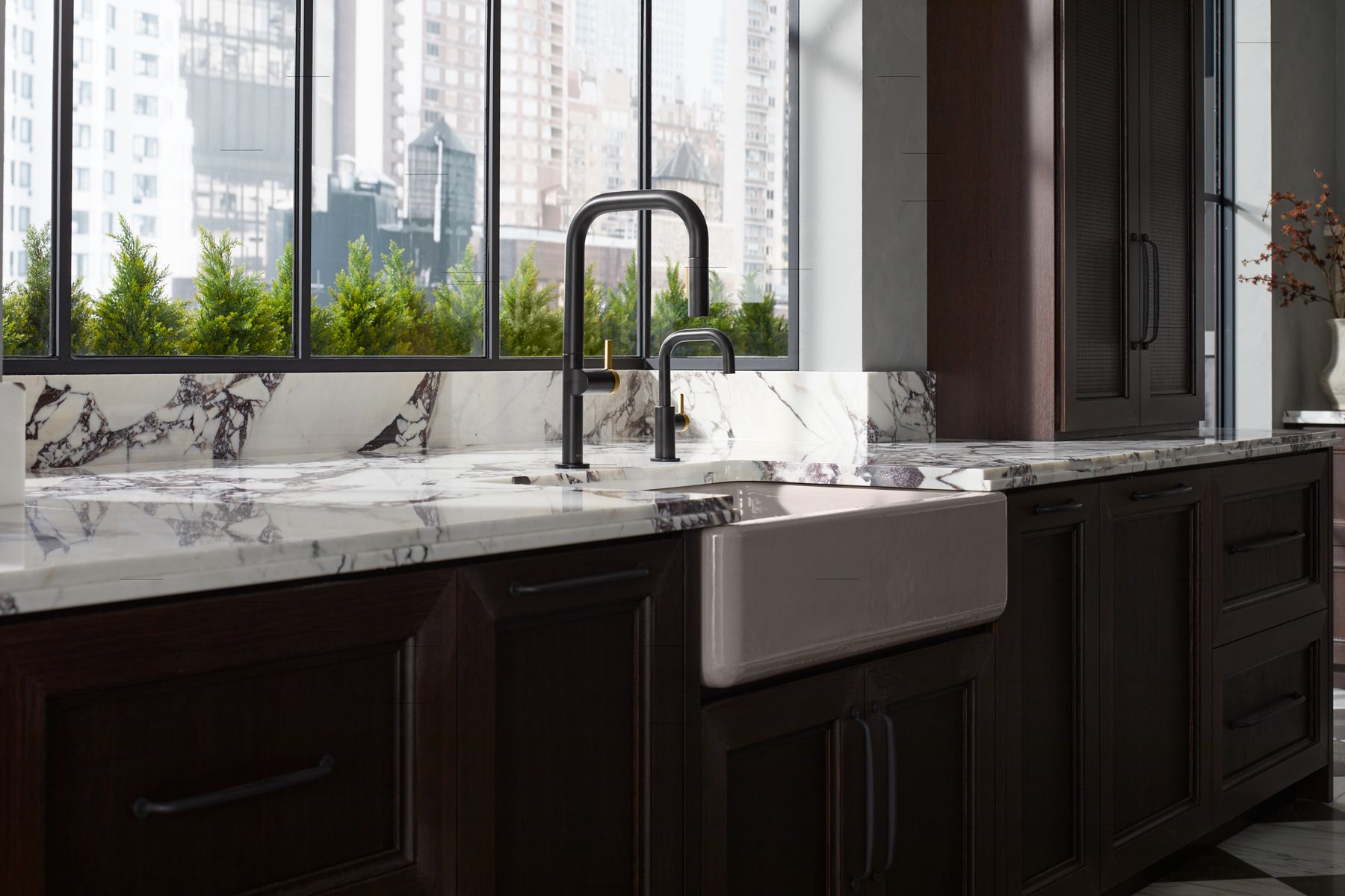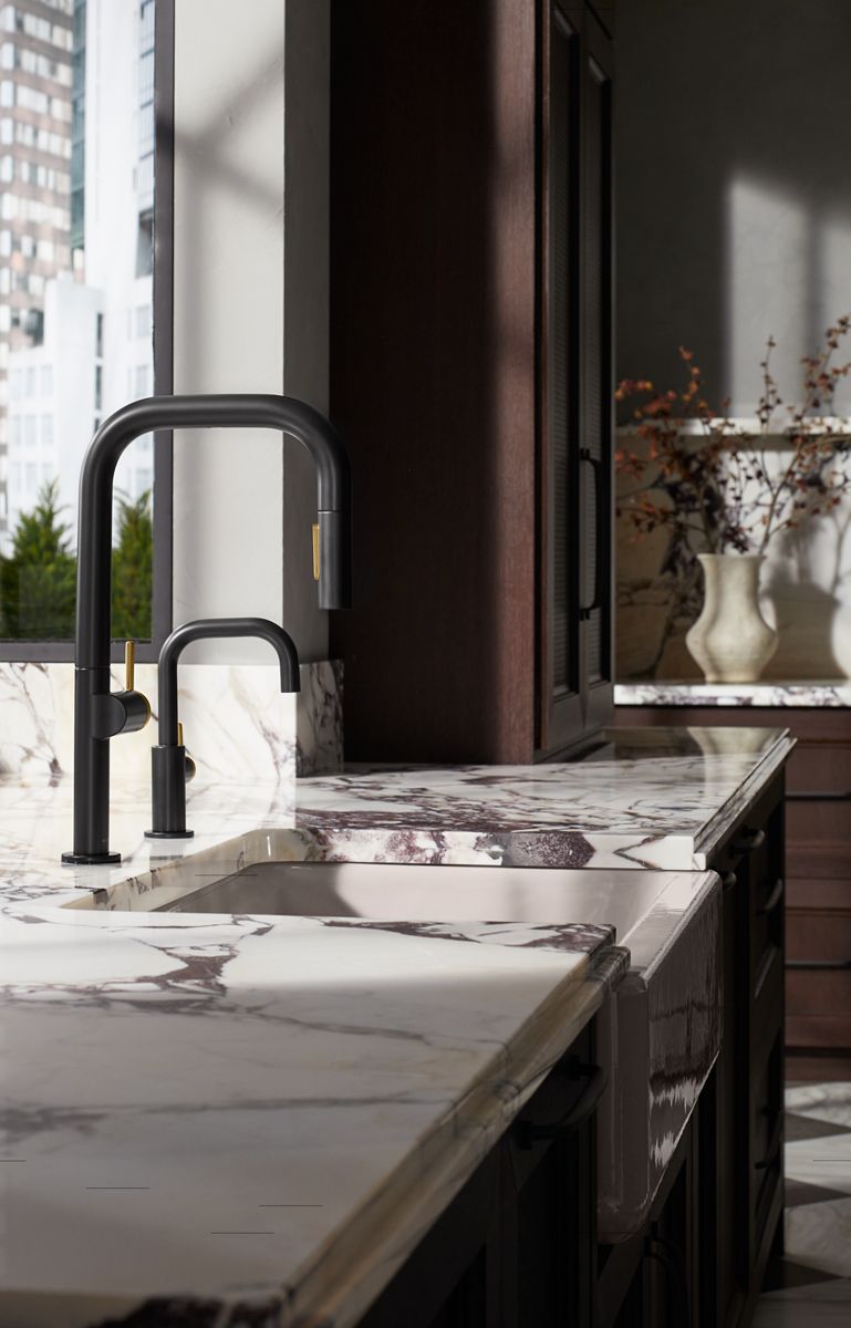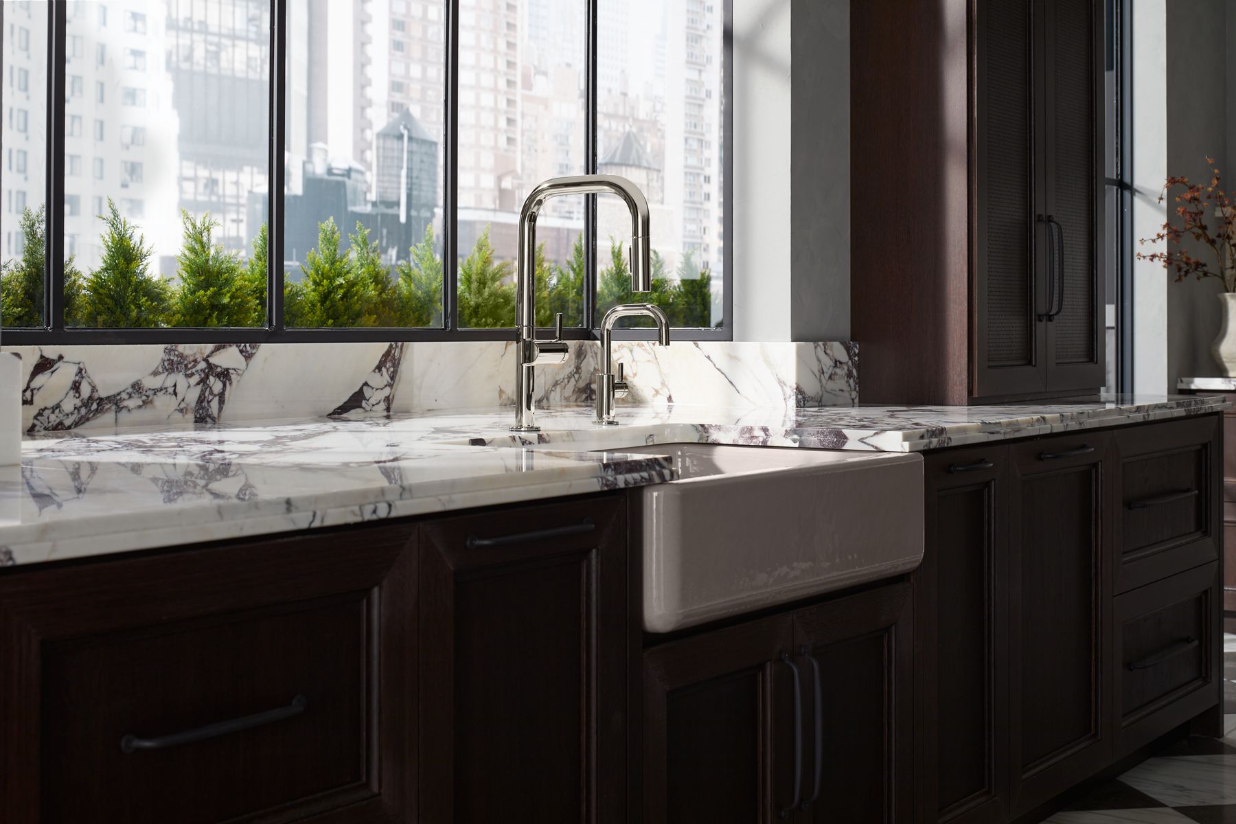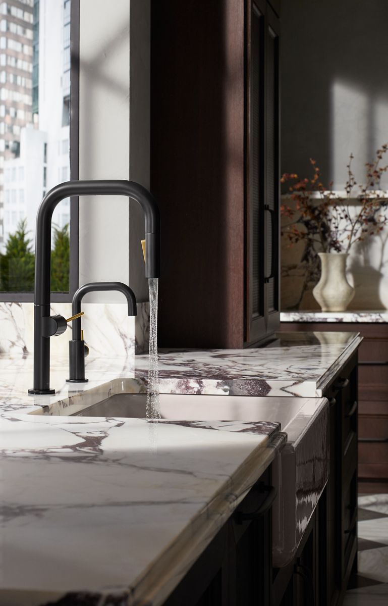 Sleek and minimalist, the Components collection exudes calm sophistication. Strong, confident lines create bold and distinctive silhouettes accentuated by refined design details. The Components pull-down kitchen sink faucet melds this very style with two spray functions, and the DockNetik secure docking system conveniently locks the sprayhead in place with not in use.