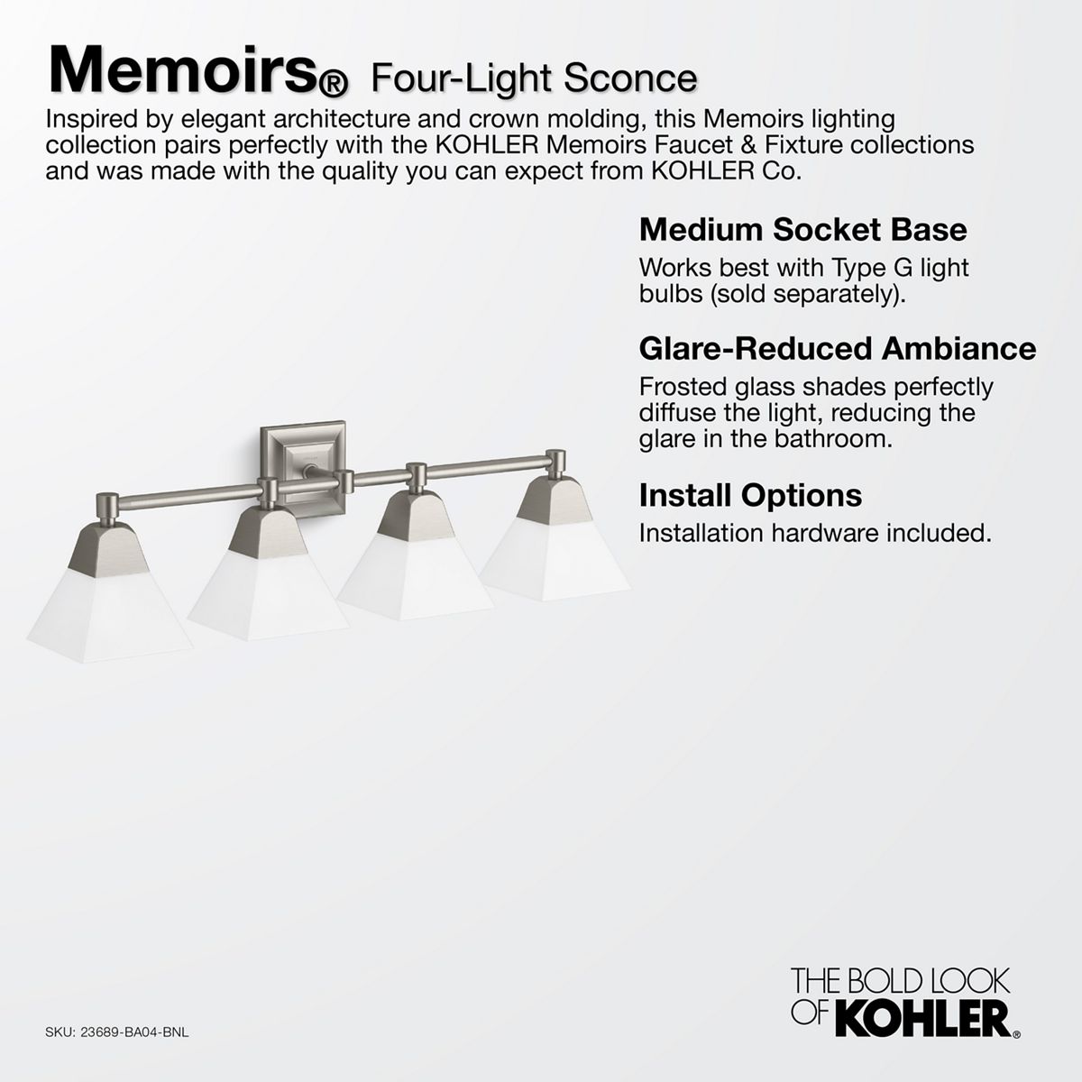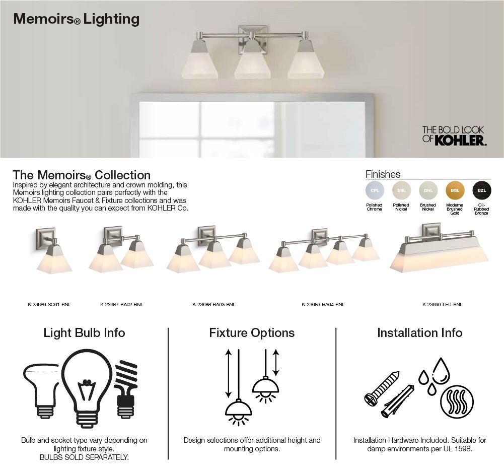 Inspired by elegant architecture and crown molding, this Memoirs lighting collection pairs perfectly with the KOHLER Memoirs Faucet & Fixture collections and was made with the quality you can expect from KOHLER Co.