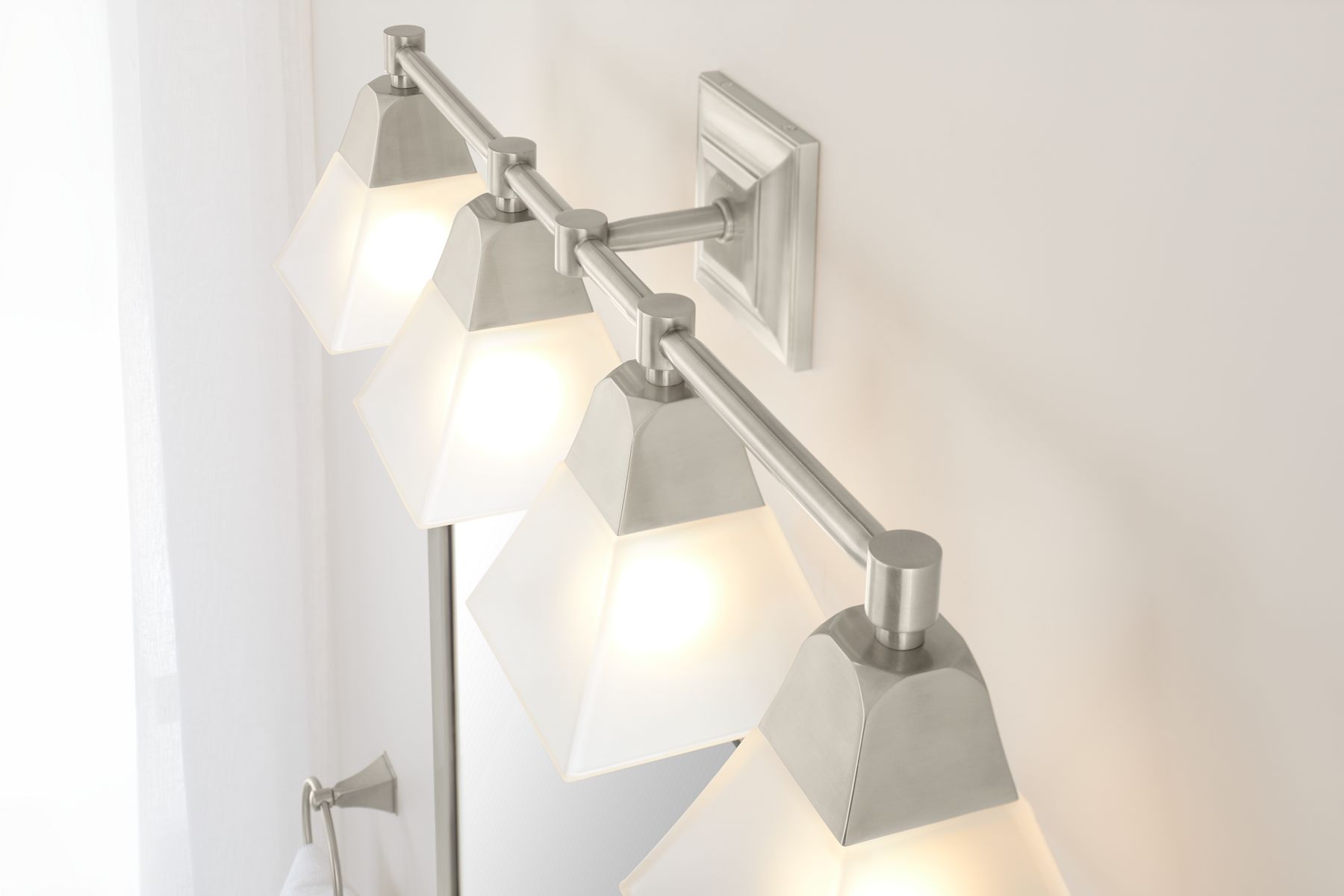 - Frosted glass shades perfectly diffuse the light, reducing glare in the bathroom