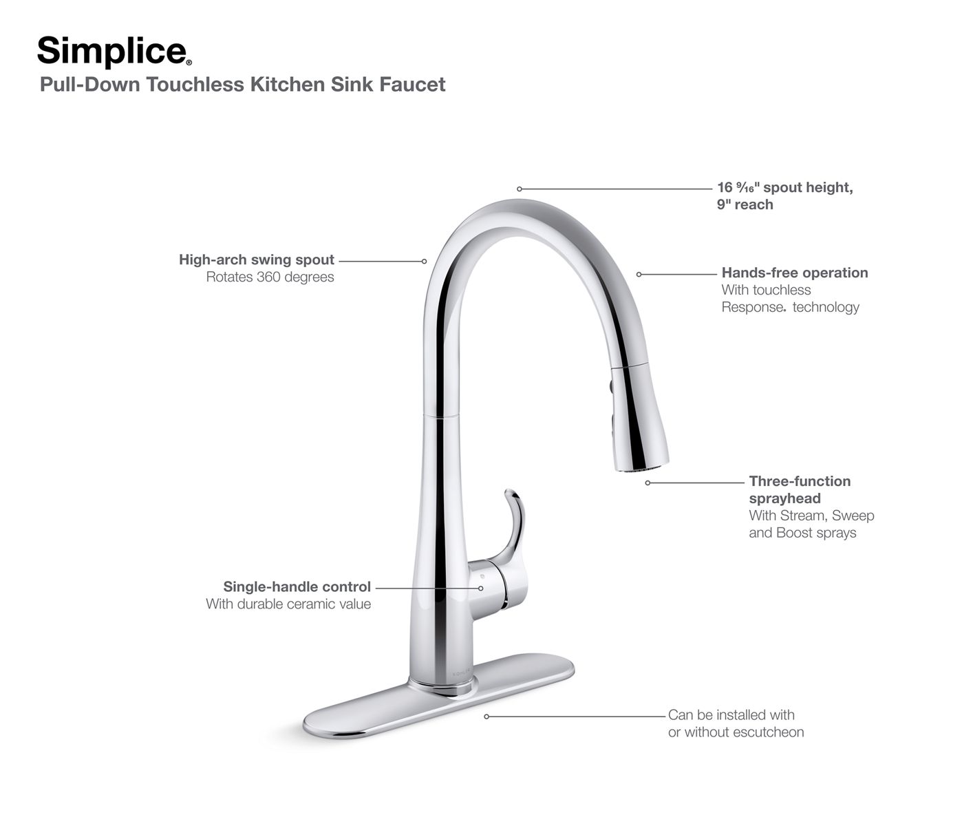 With a state-of-the-art sensor under the spout, the Simplice touchless faucet allows you to speed through cooking and cleanup tasks and enjoy a cleaner, more hygienic kitchen environment. Intuitive Response technology is in tune with your every move: a simple wave of your hand—or an object such as a pan—turns it on or off. The sensor is precision-designed to prevent false activations when you're working in the sink area. Sweep spray is a forceful blade of water for easier cleaning, while Boost delivers an increased flow ideal for filling pots and pitchers.