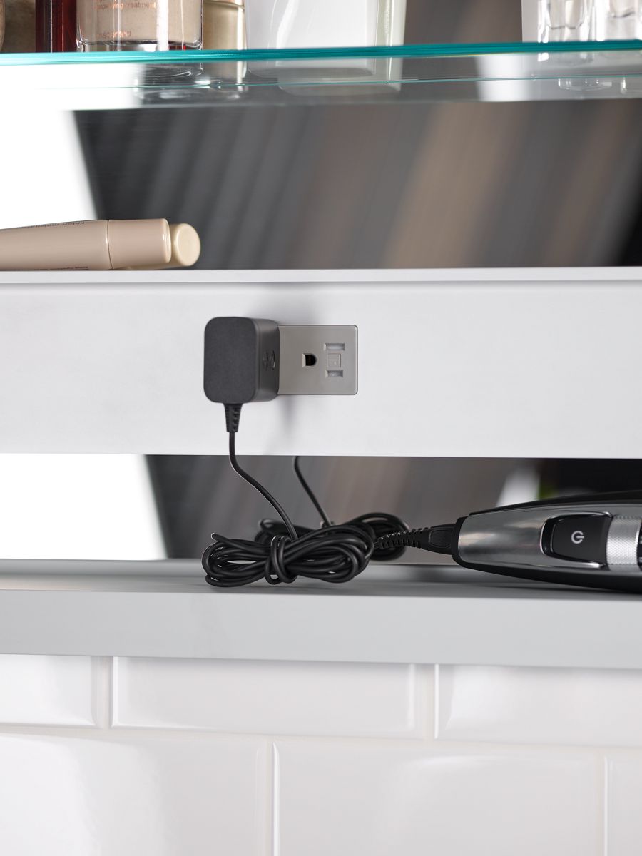 - Internal aluminum shelf has two electrical outlets for powering small devices such as toothbrushes and shavers