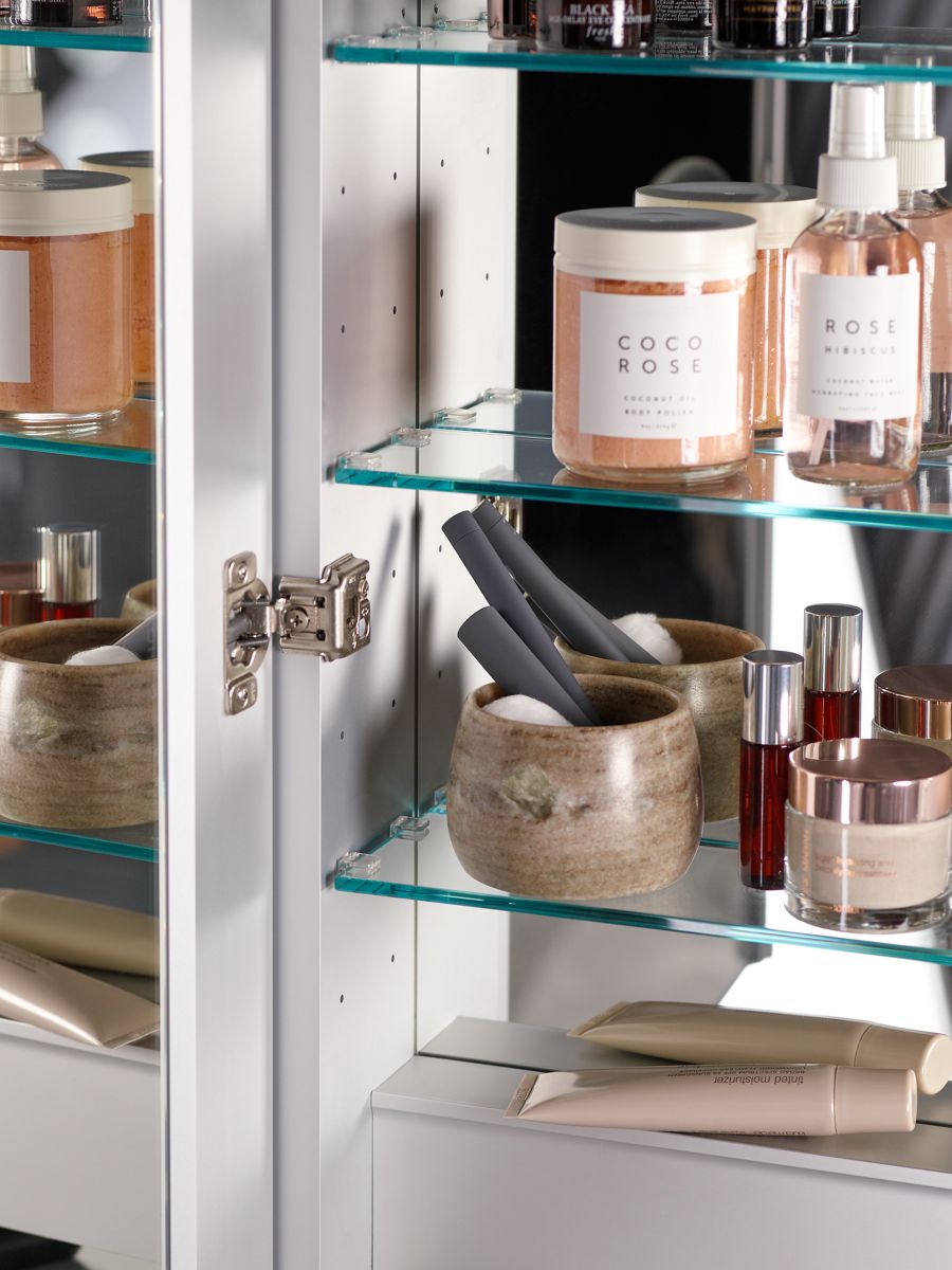 - Two adjustable tempered-glass shelves offer additional bathroom storage