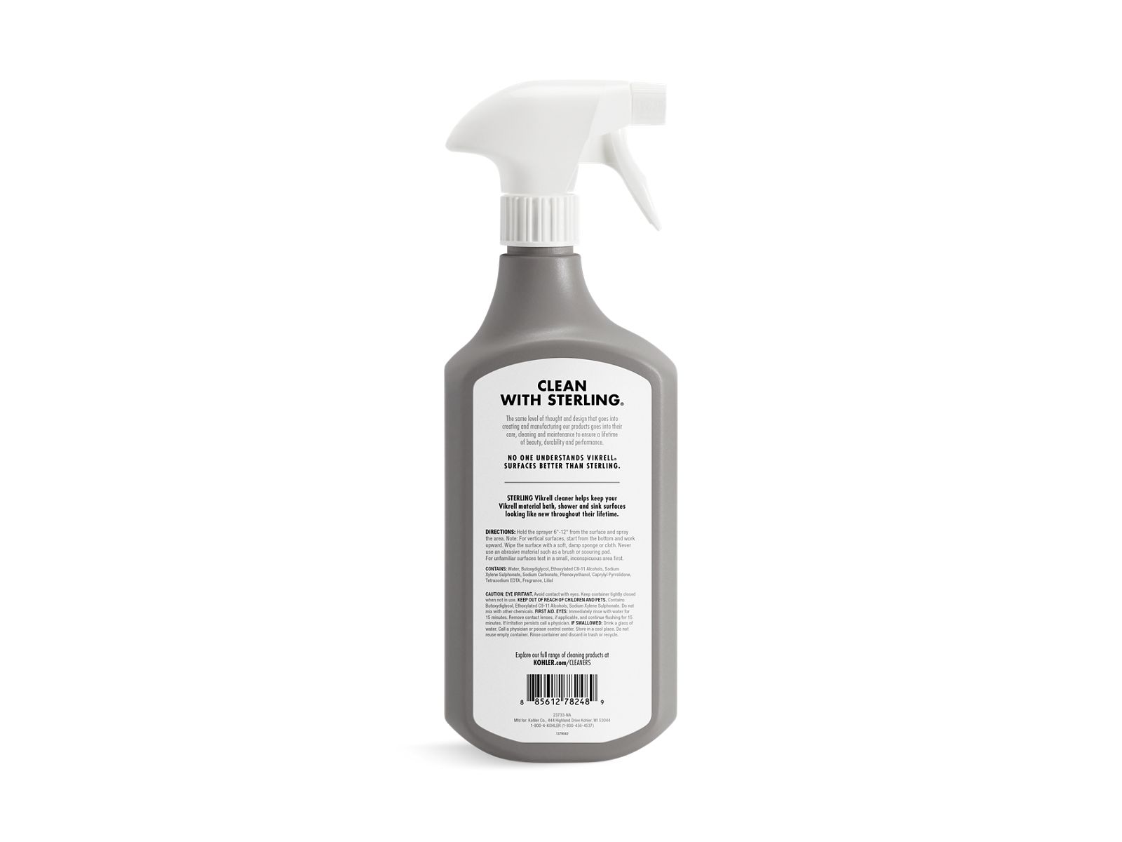 KOHLER premium formula Vikrell® cleaner cleans and removes soap scum, lime and other heavy soil from your STERLING® Vikrell® material sink, bath and shower surfaces. This cleaner keeps your STERLING Vikrell® material products looking like new throughout their lifetime.