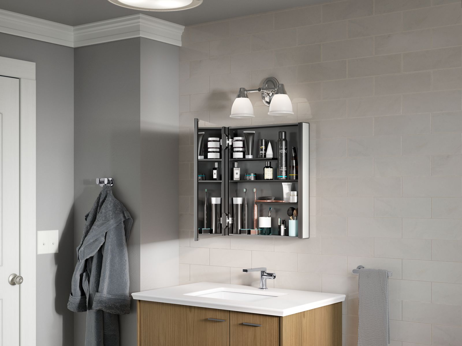 Maximize your bathroom storage with the Maxstow™ medicine cabinet. Staggered shelving holds tall and short items with no wasted space, fitting everything you need and keeping clutter off your countertop. The slim 3-1/2"-deep design provides the same internal storage space as traditional 5"-deep cabinets. Installation is fast and easy—simply screw to the wall, right out of the box.