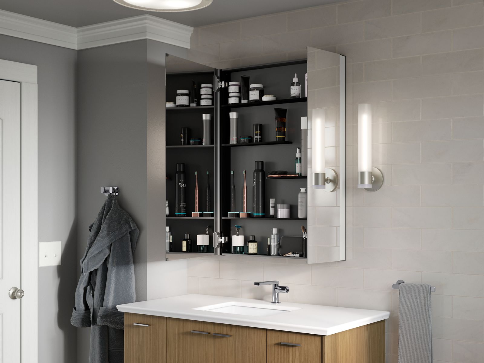 Maximize your bathroom storage with the Maxstow™ medicine cabinet. Staggered shelving holds tall and short items with no wasted space, fitting everything you need and keeping clutter off your countertop. The slim 3-1/2"-deep design provides the same internal storage space as traditional 5"-deep cabinets. Installation is fast and easy—simply screw to the wall, right out of the box.