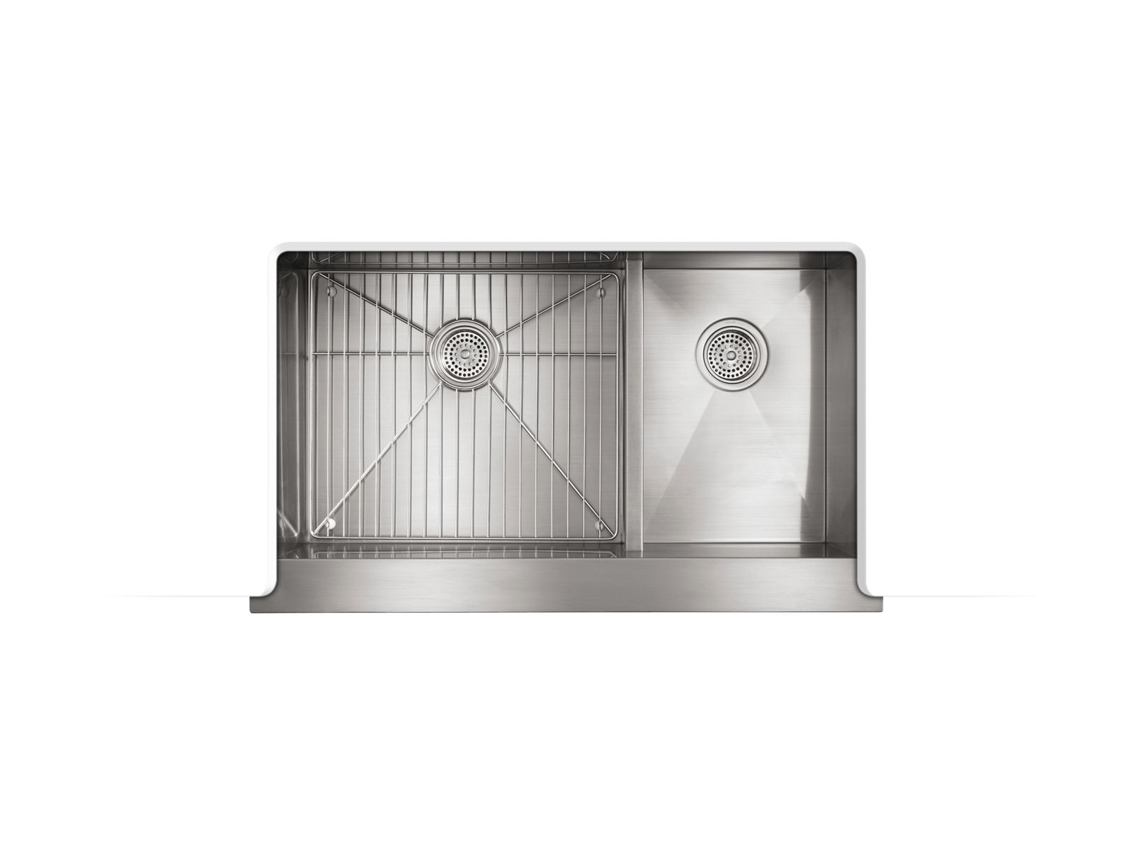 Handcrafted from stainless steel, Vault brings bold new style to the traditional farmhouse sink. Tightly angled corners maximize basin space, and a lowered divider offers freedom of movement between basins. An included bottom sink rack fits the large bowl and helps prevent scratches. Due to its shortened apron, this sink does not require a special apron-front cabinet, making it easy to install with most new or existing 36-inch cabinetry. The Self-Trimming® design requires only a simple rough cut, overlapping the cabinet face for beautiful results.