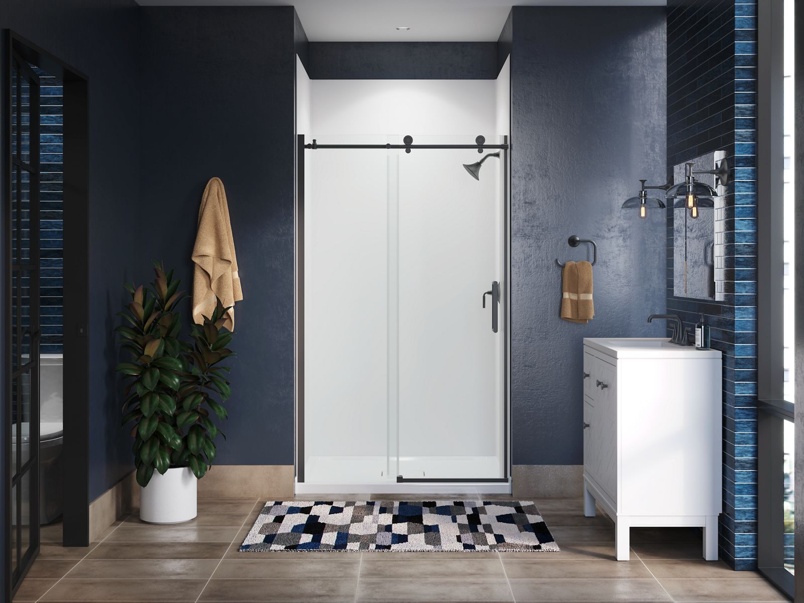 Add the final touch to your showering space with the luxurious, frameless Composed sliding shower door. This contemporary design includes exposed rollers engineered to glide across a heavy-duty top rail, offering a bold style statement and smooth operation. The door offers ample head clearance and features beautiful back-to-back handles for easy entry and exit. This shower door includes heavy 3/8" thick tempered glass and Controlled Close™ technology on the sliding panel to securely close the door for exceptional water containment. Simple installation includes out-of-plumb adjustability of 3/8" on both the fixed and sliding glass panels.