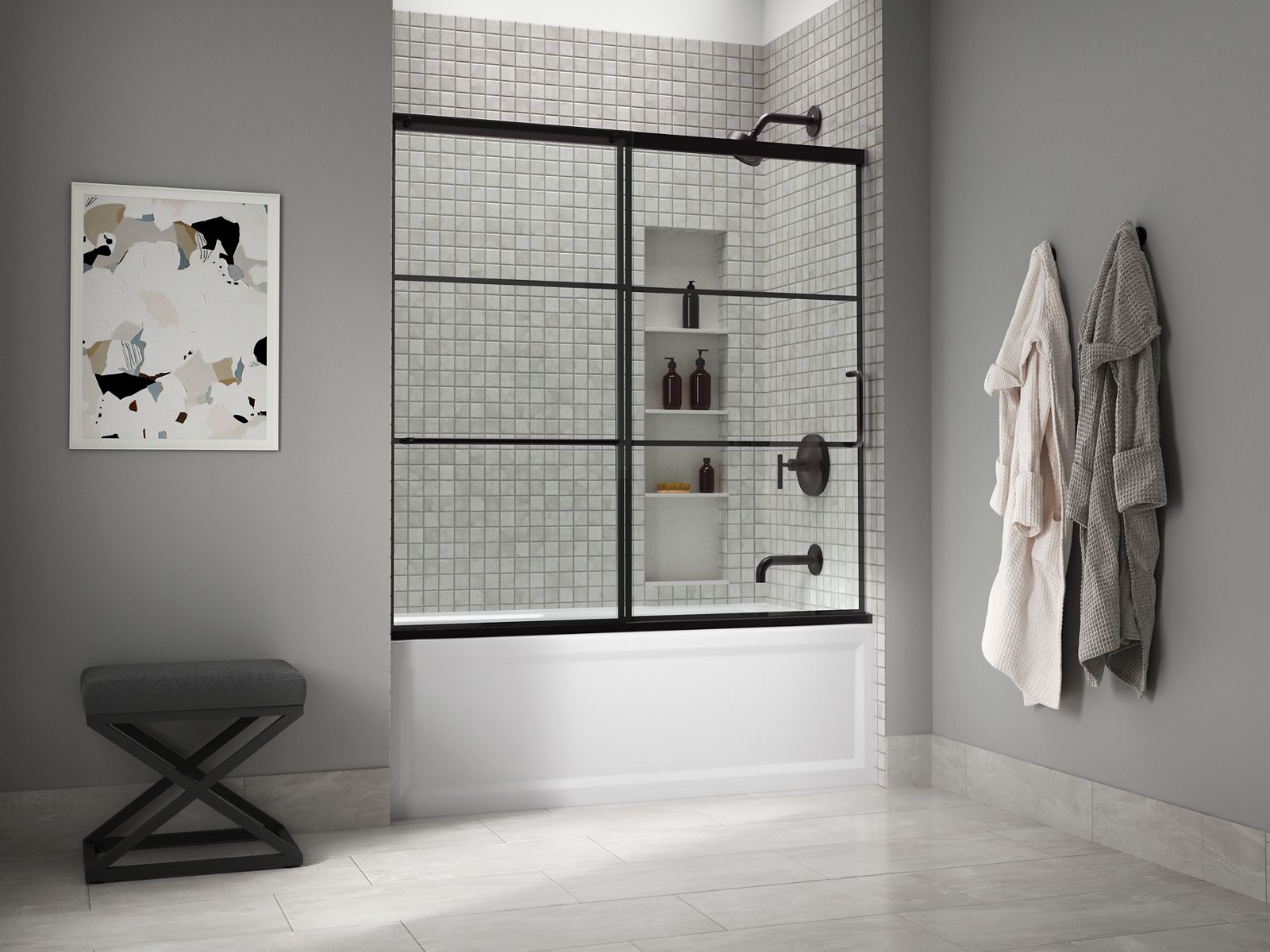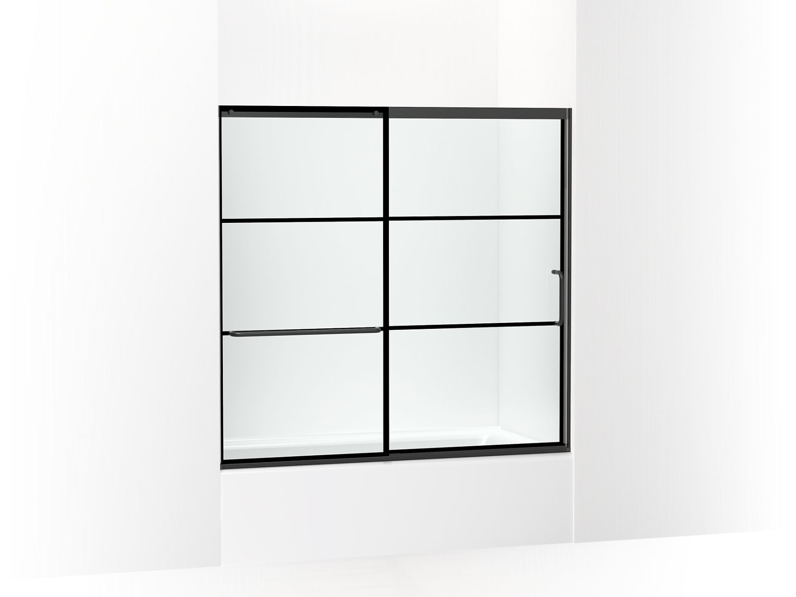 Elate® Sliding Bath Door, 56-3/4" H X 56-1/4 - 59-5/8" W With Heavy 5/16" Thick Crystal Clear Glass With Rectangular Grille Pattern Matte Black