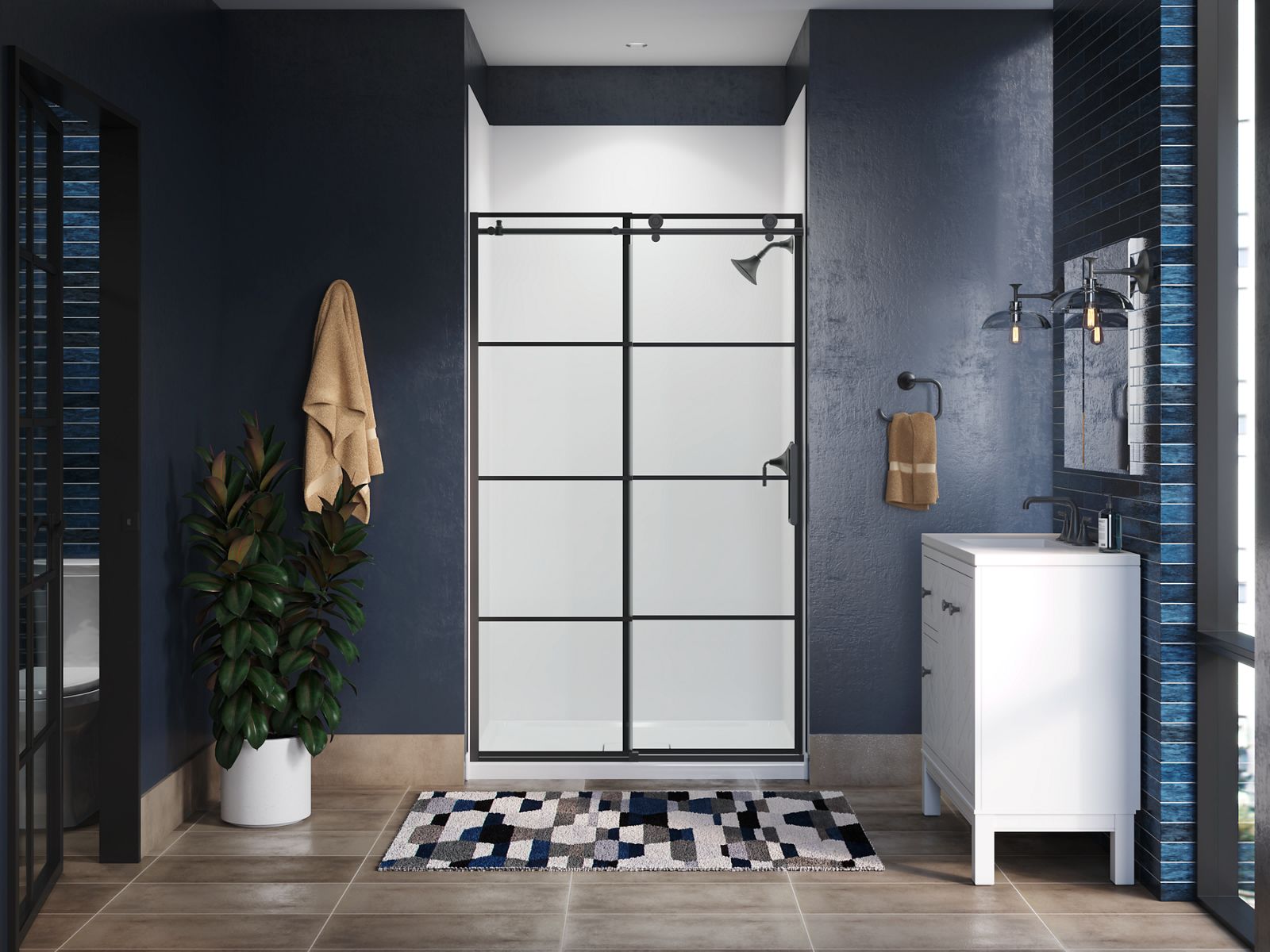 Composed™ Sliding Shower Door, 78" H X 44-1/8 - 47-7/8" W, With 3/8" Thick Crystal Clear Glass With Rectangular Grille Pattern Matte Black