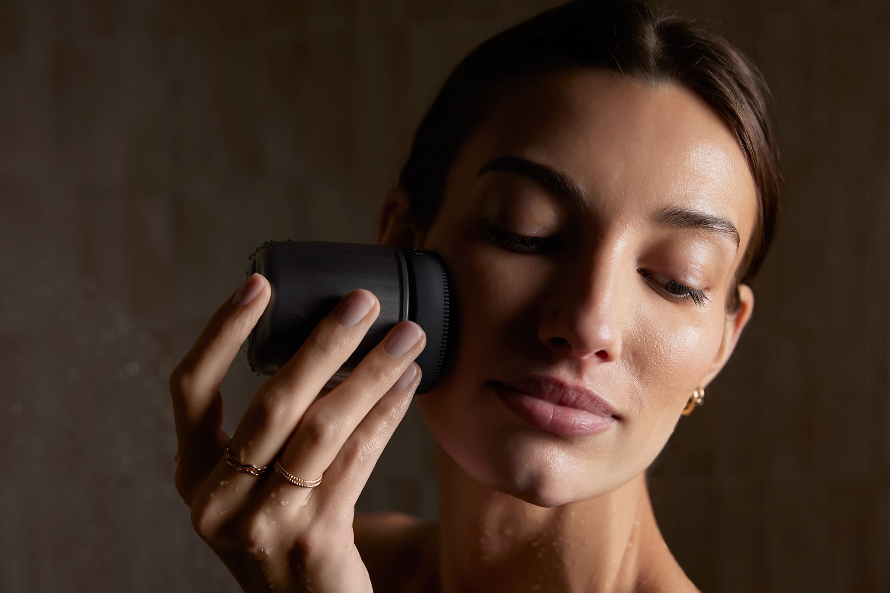 - All-in-one cleansing device features four interchangeable attachments: facial brush, body brush, body scrubber, and body massager