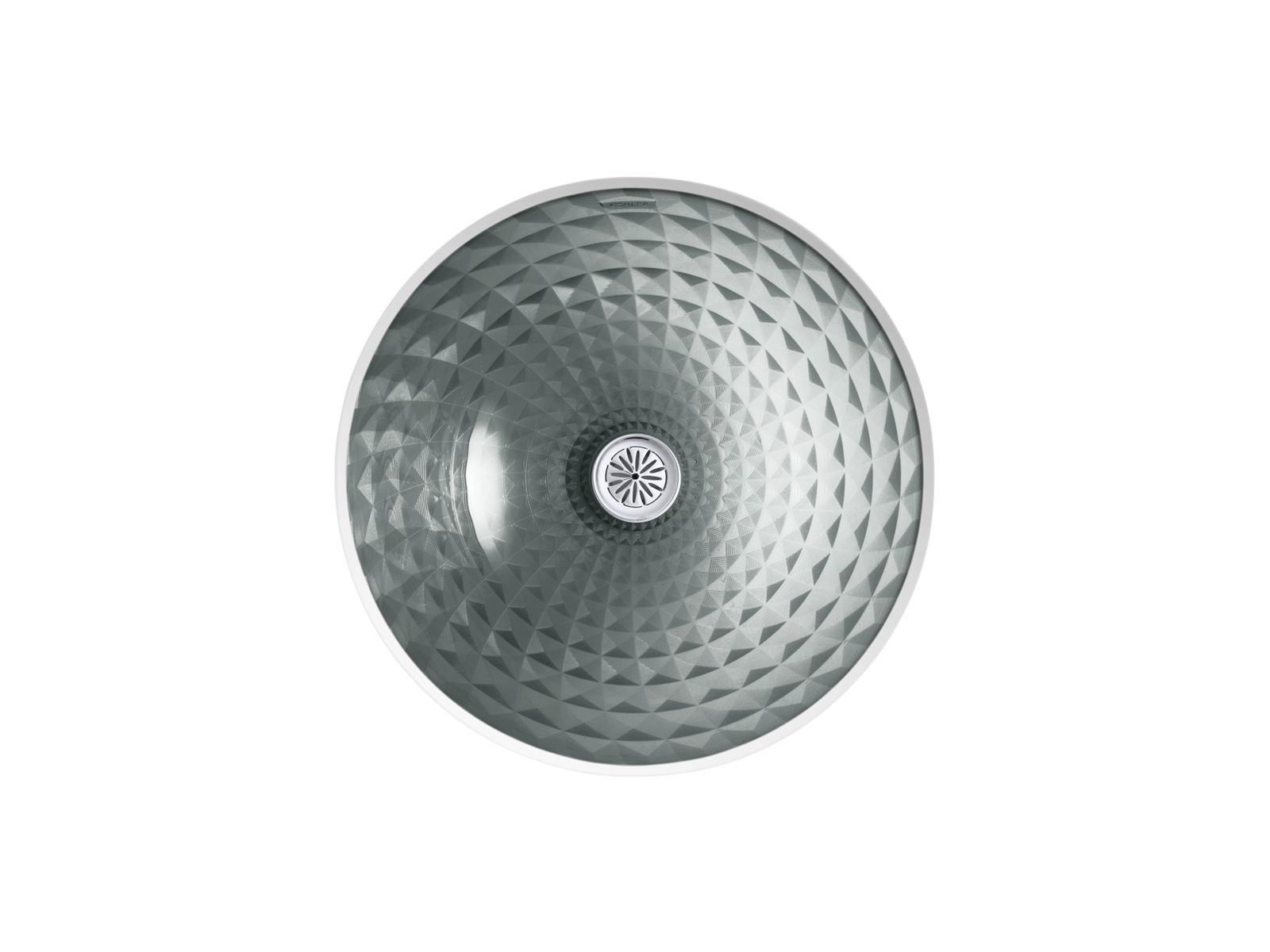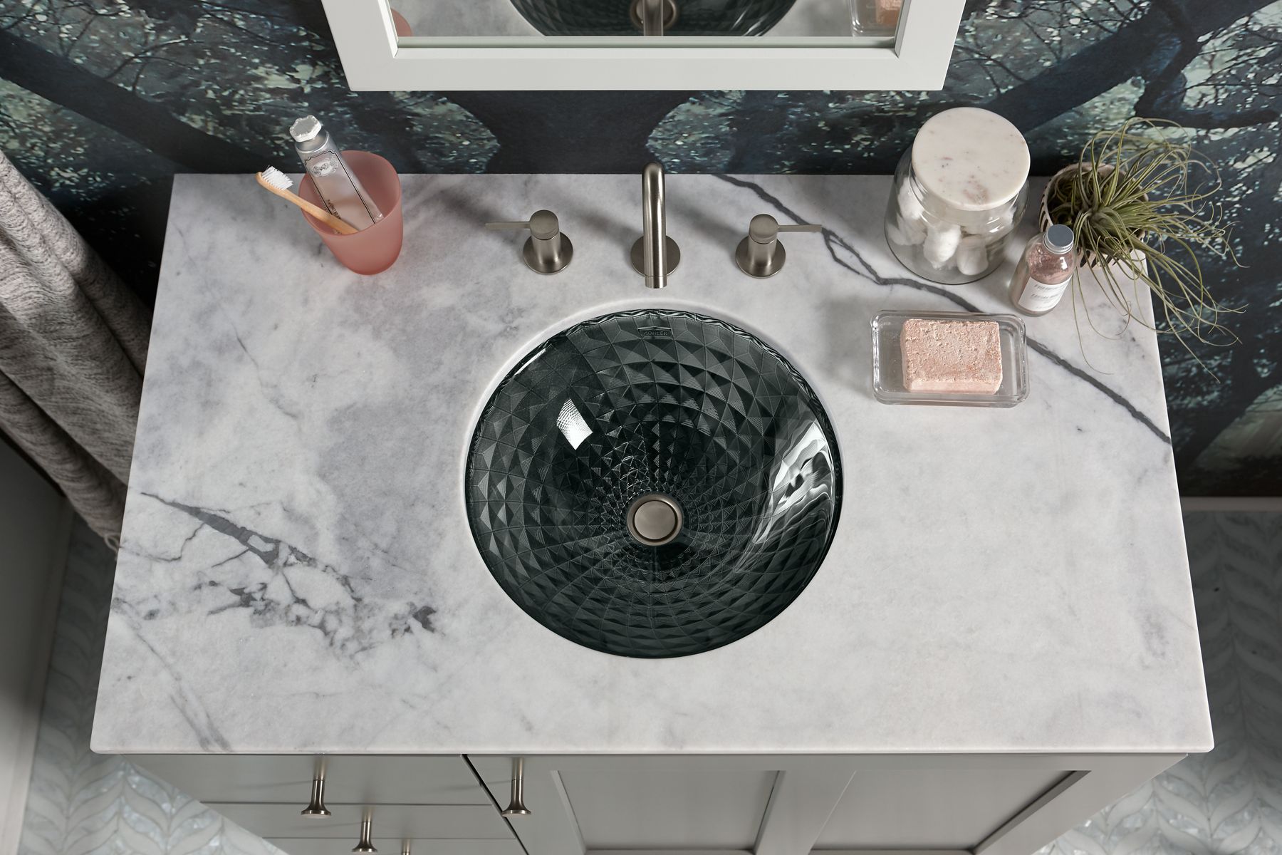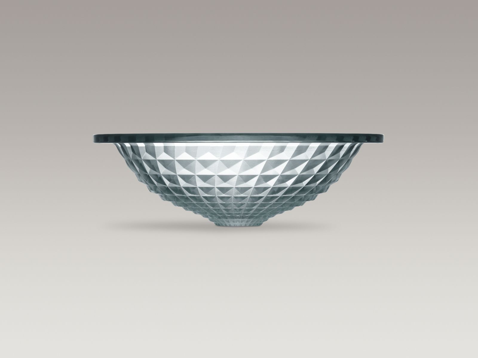 With reflective facets of cut glass, Kallos shines like a jewel in the bath or powder room. Part of the Artist Editions line of bath sinks, the spun-glass under-mount basin offers a distinctive architectural pattern reminiscent of fine crystal. This basin's design creates stunning visual depth while appropriately concealing the view of toiletries stored inside the vanity.