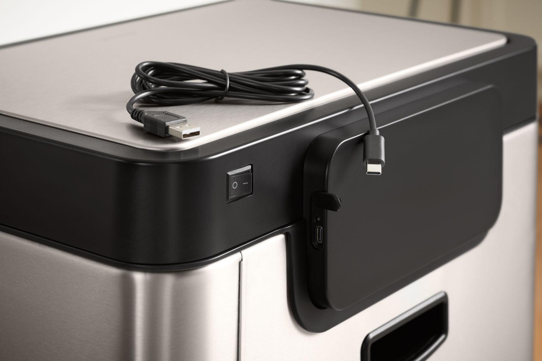 - Box includes: 13-gallon (49 liter) motion-sensor can, removable liner bin, and USB charging cable