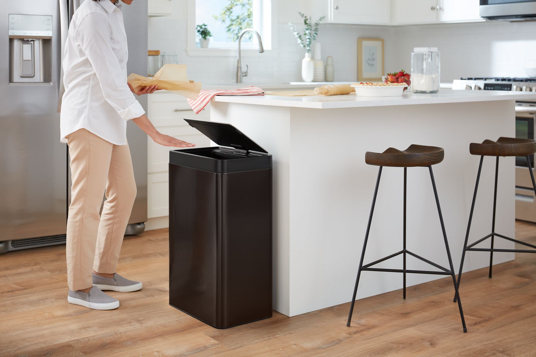 - Wave hand over motion sensor for touchless open; lid automatically closes via timer