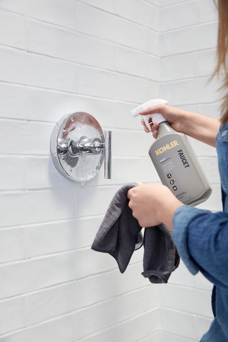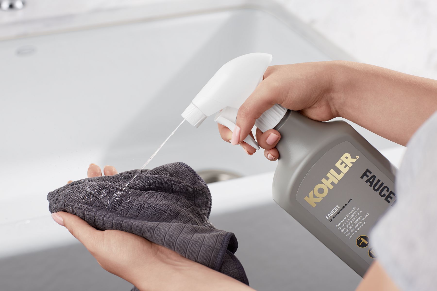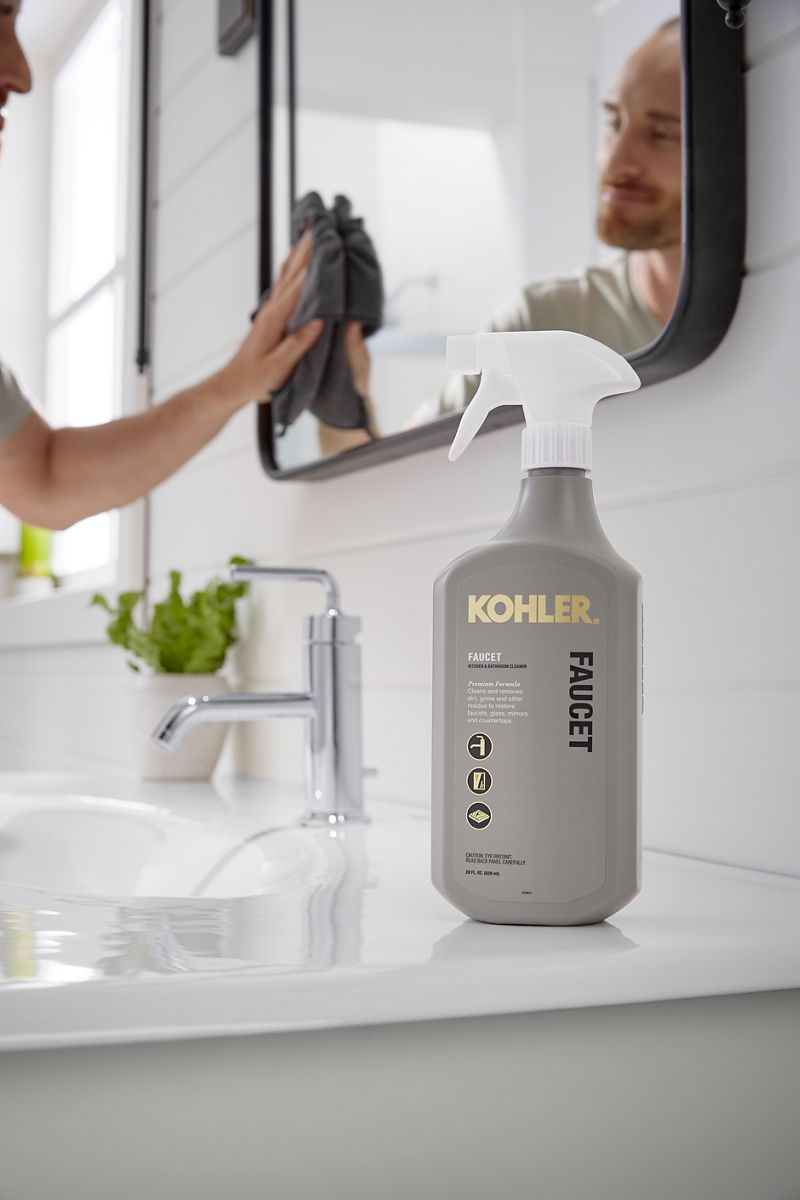 KOHLER premium faucet cleaner cleans and removes dirt, grime and other residue to restore faucets, glass, mirrors and countertops. Leaving a streak-free shine, this cleaner keeps your KOHLER products looking brand-new throughout their lifetime.