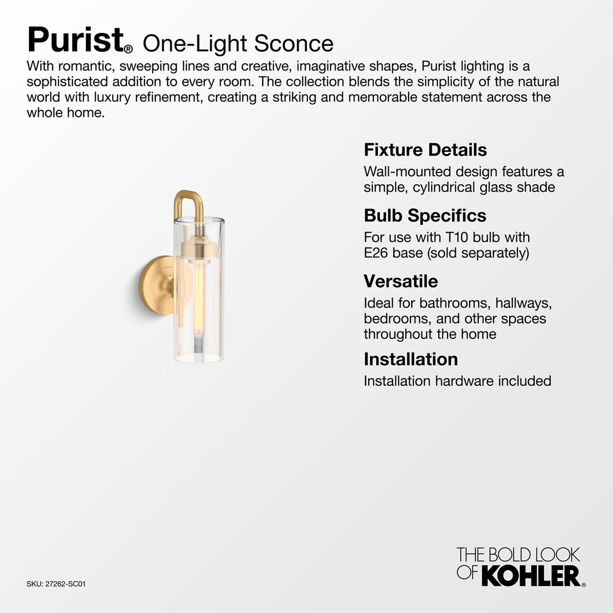 The sleek lines and modern design of Purist lighting complement contemporary home decor. Minimalist sconces, pendants, and linear chandeliers provide a soft, inviting warmth, reflecting elegant simplicity. Available in an array of finishes, these versatile fixtures were created to complement the KOHLER® Purist faucet collection for a cohesive home design.