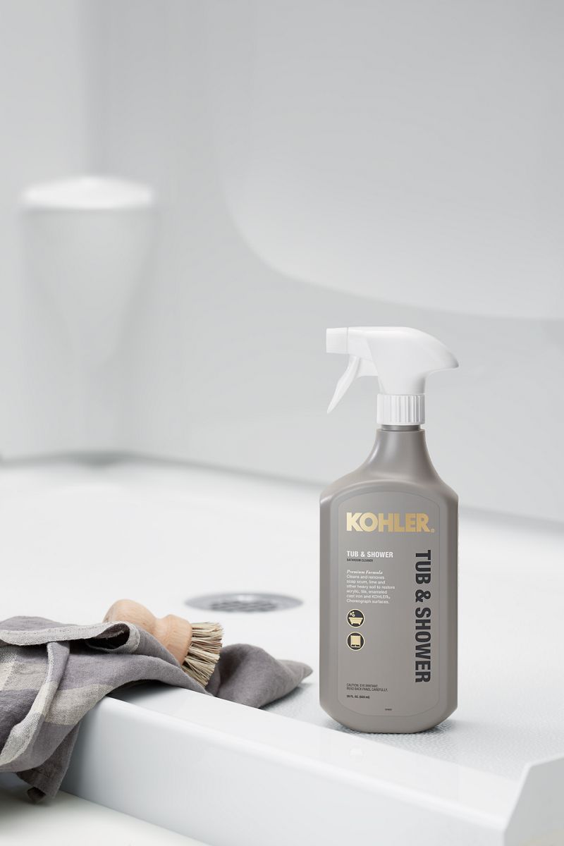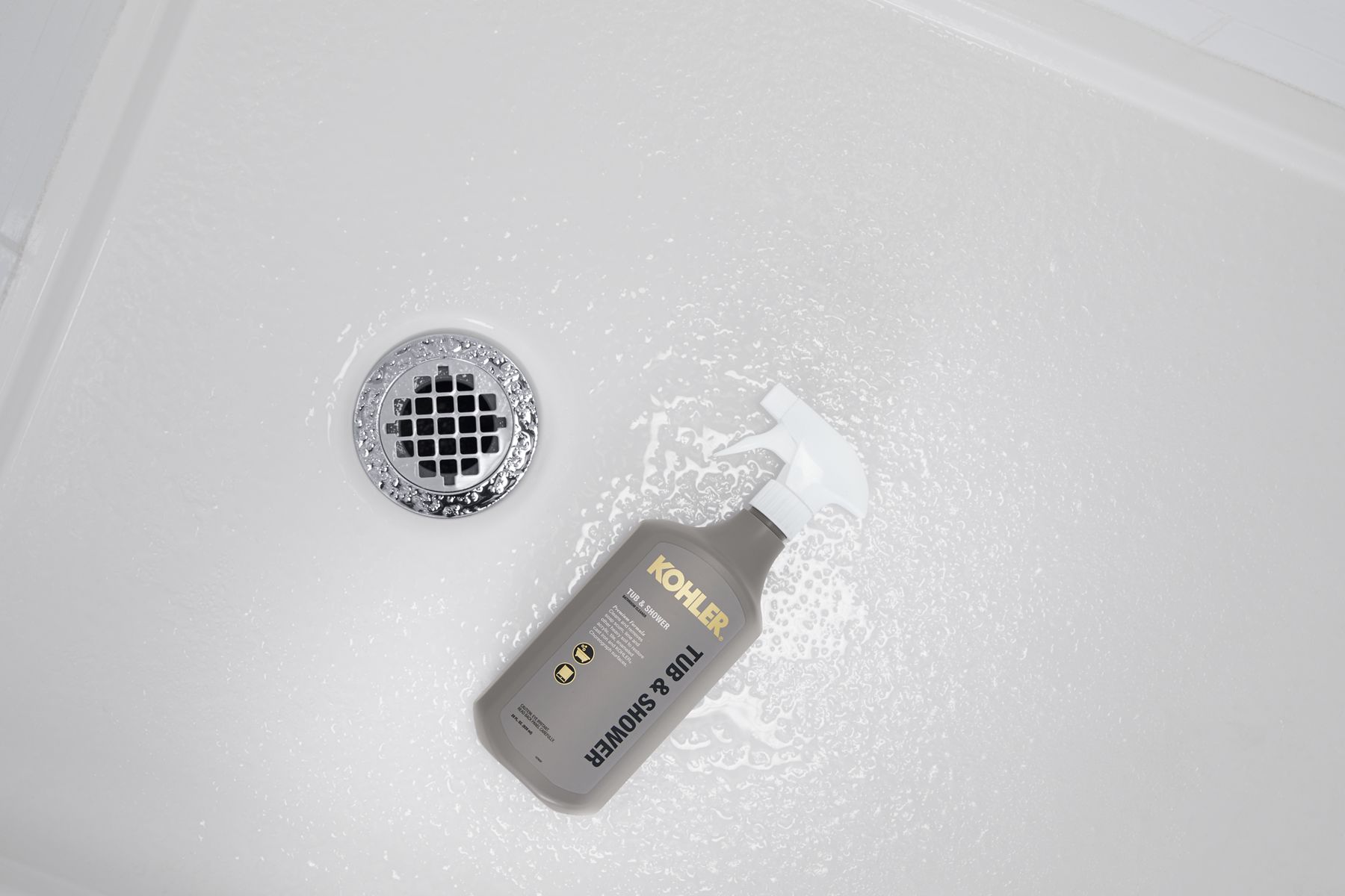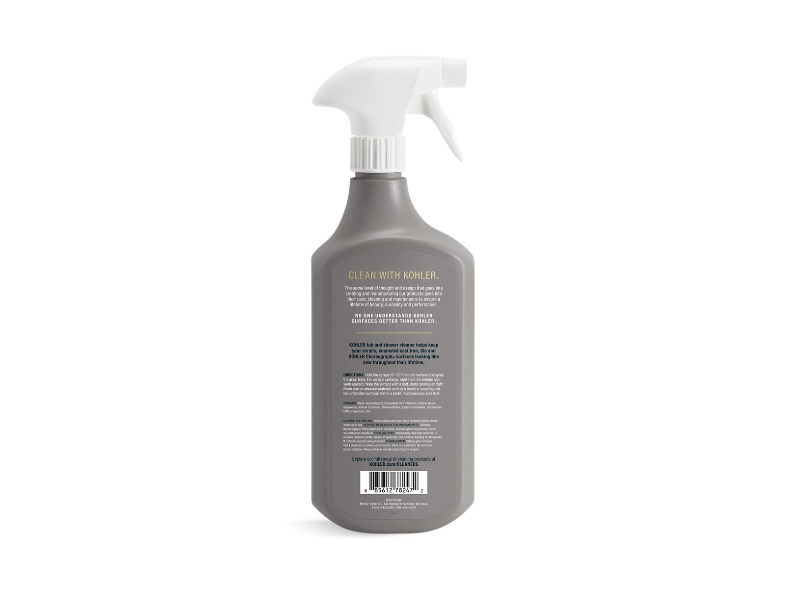 KOHLER premium formula tub & shower cleaner cleans and removes soap scum, lime and other heavy soil to restore acrylic, tile, enameled cast iron, Lithocast/solid surface, Luxstone™ and KOHLER Choreograph® surfaces.