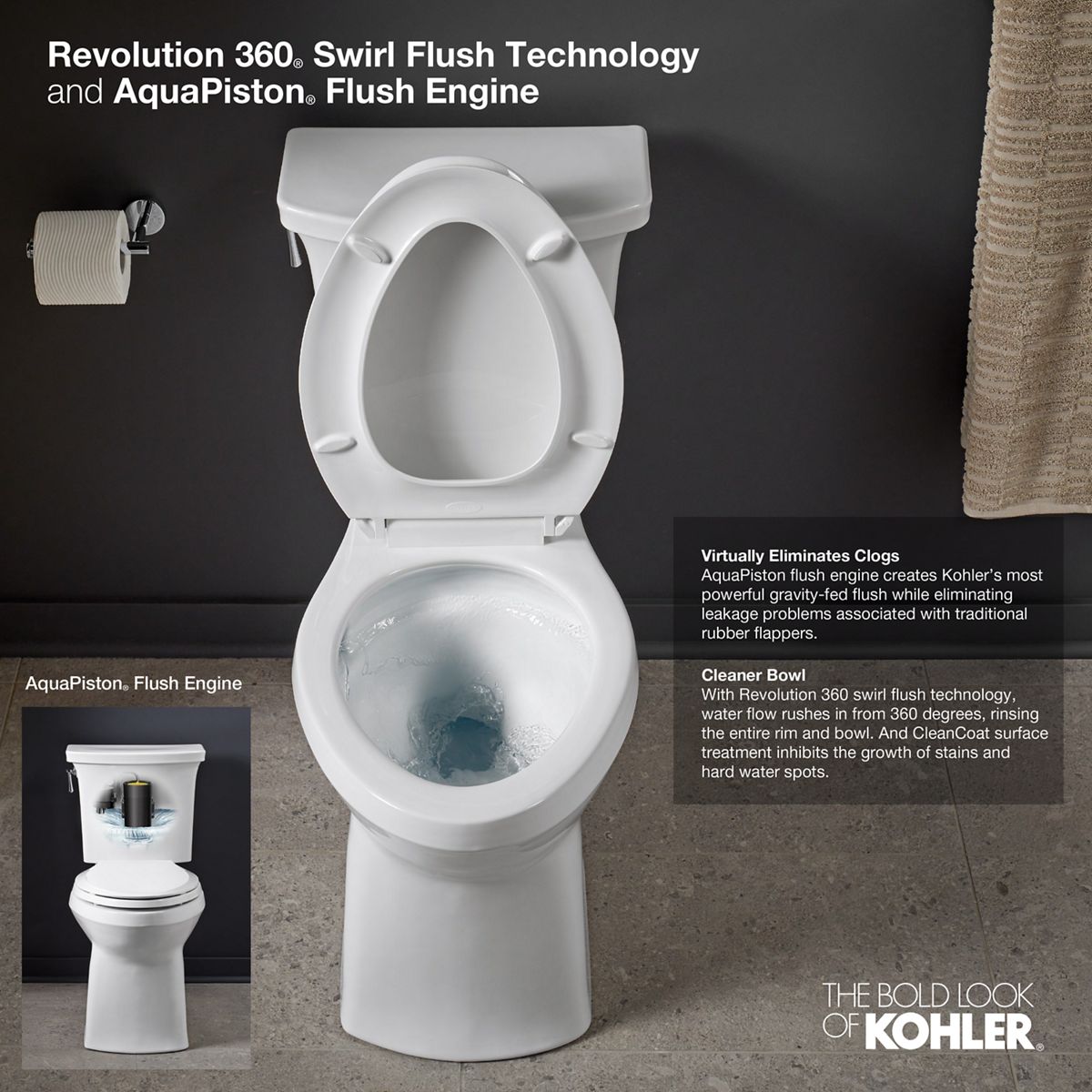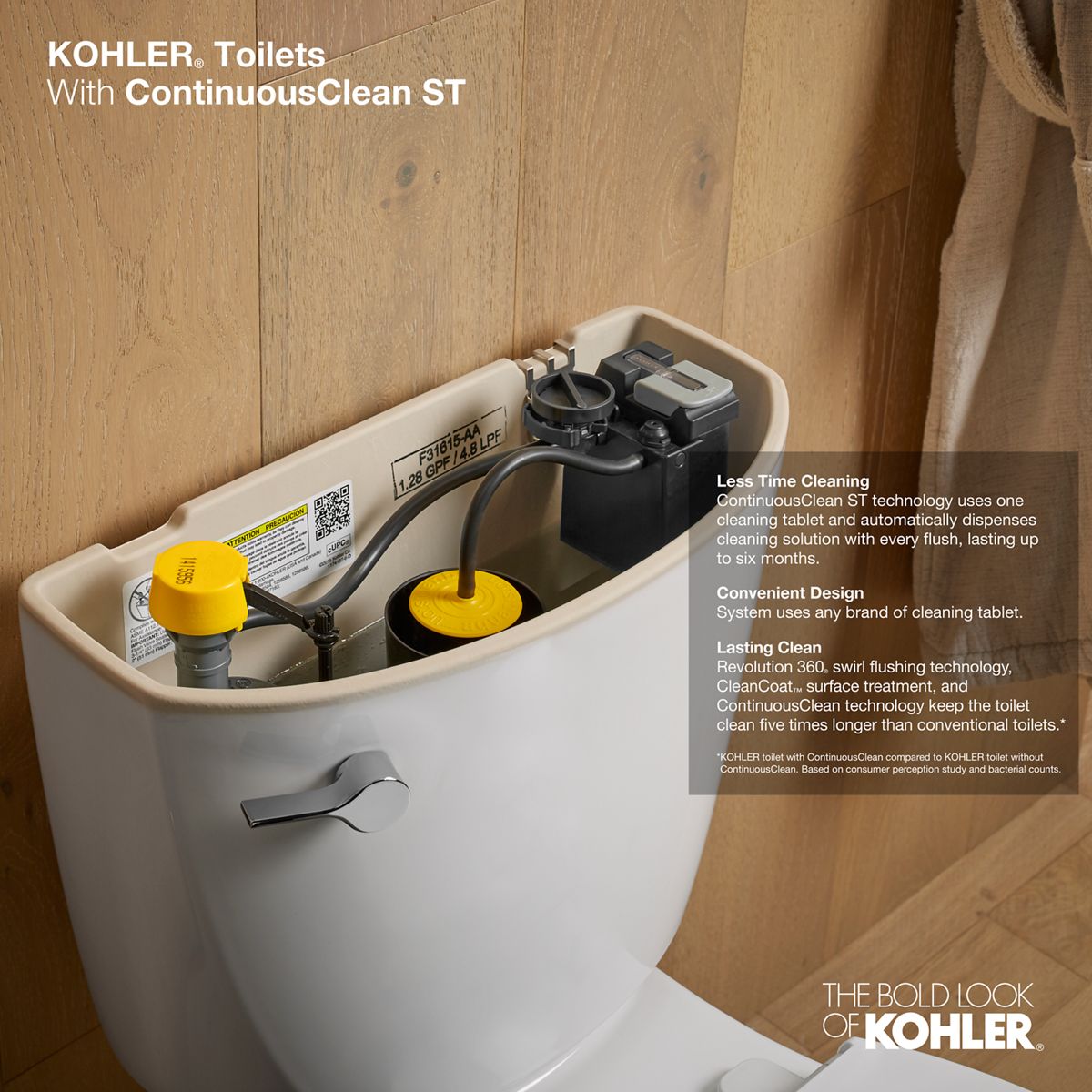 - Combination of ContinuousClean technology with CleanCoat™ surface and Revolution 360® flushing technology keeps the bowl cleaner 5x longer than conventional KOHLER toilets. (Based on 2019 consumer perception study and bacterial counts)