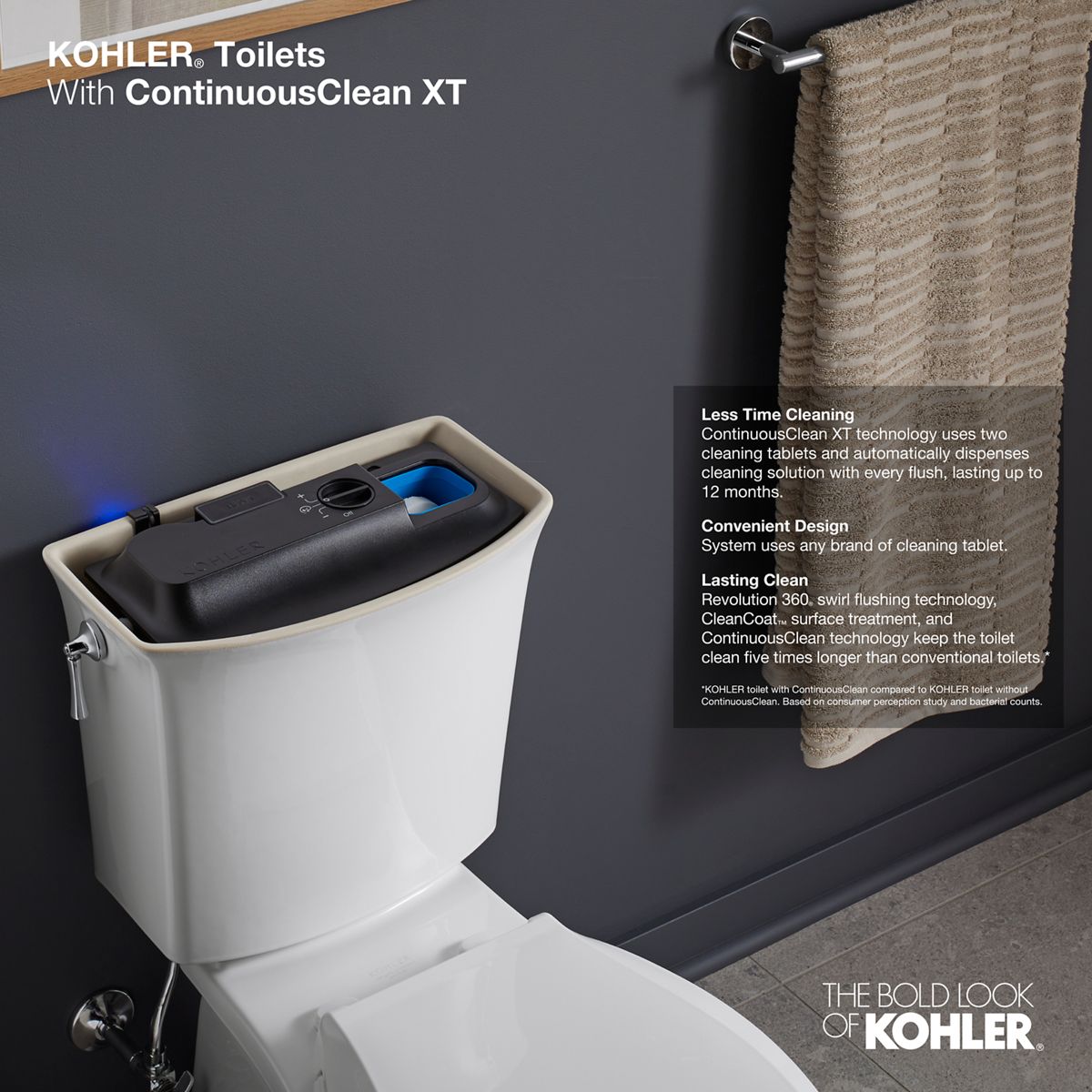 The Corbelle two-piece toilet delivers a powerful swirling flush in a sleek skirted design. Kohler's most complete flush ever, Revolution 360® flushing technology keeps your bowl cleaner longer than a conventional flush. Installation is easy with the ReadyLock™ system: the skirted trapway installs to the floor flange and attaches to the toilet, eliminating the need to drill holes while offering the same secure installation as nonskirted toilets. This WaterSense®-labeled high-efficiency toilet brings you annual water savings.