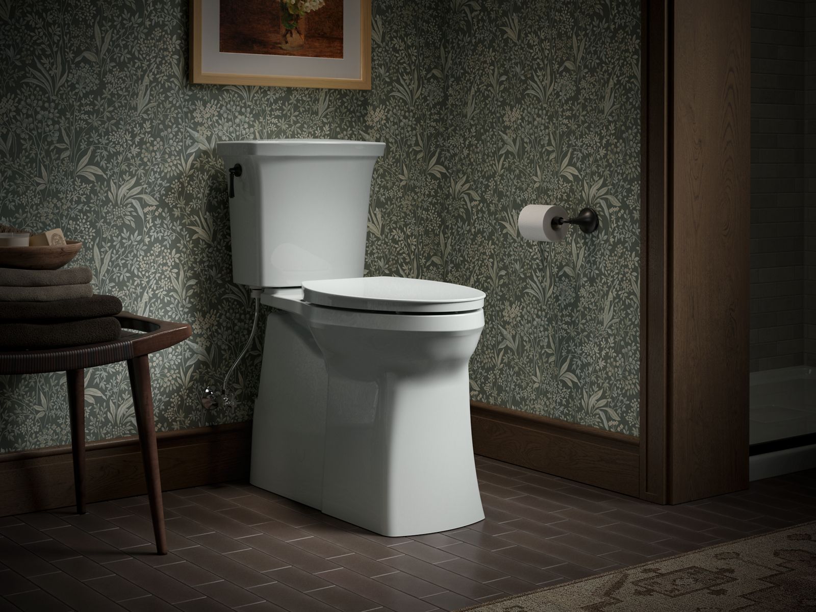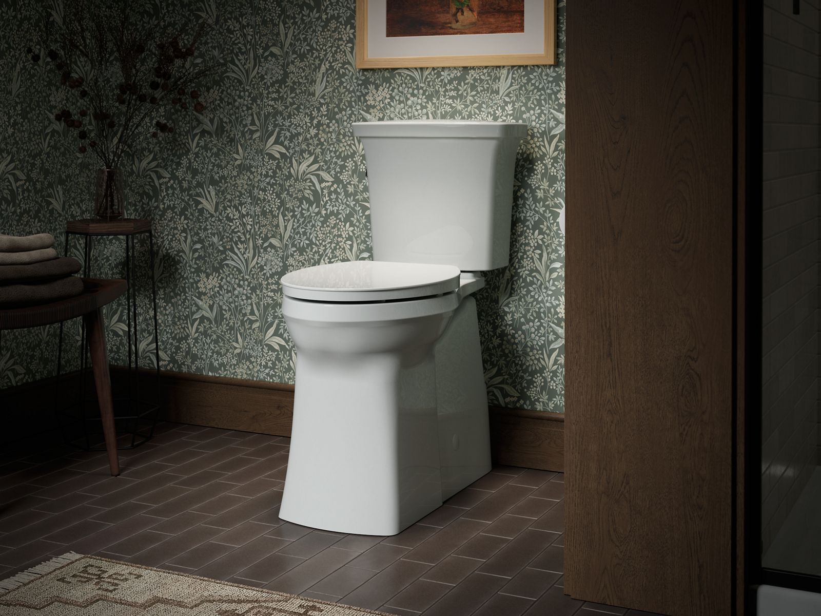 The Corbelle Tall two-piece elongated toilet is 2-1/2" taller than Comfort Height® toilets to provide ultimate accessibility and ease of use. Corbelle Tall delivers a powerful swirling flush with Revolution 360® flushing technology to keep your bowl clean longer than a conventional flush, and the ContinuousClean XT system works with white cleaner tablets to add even more cleaning power. The toilet features a skirted trapway with graceful, clean lines and is easy to install with the ReadyLock® system because it installs to the floor flange, eliminating the need to drill holes while offering the same secure installation as nonskirted toilets.