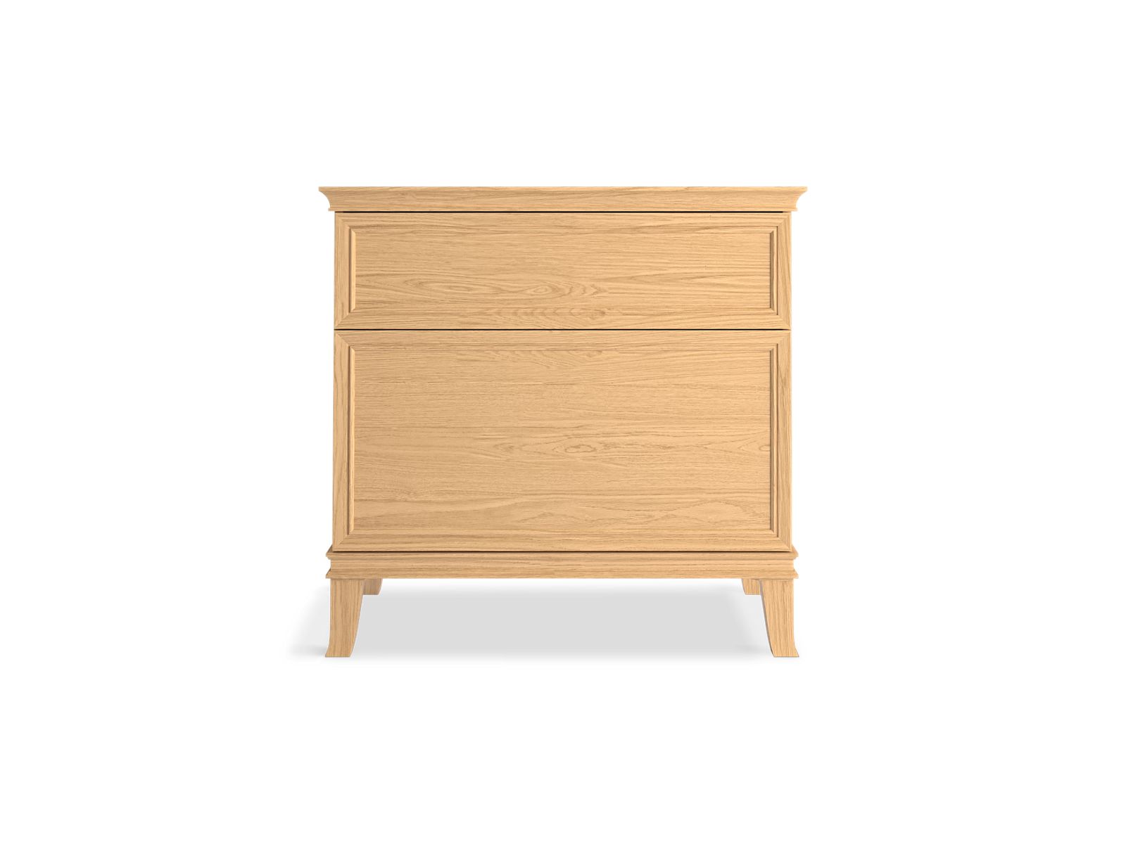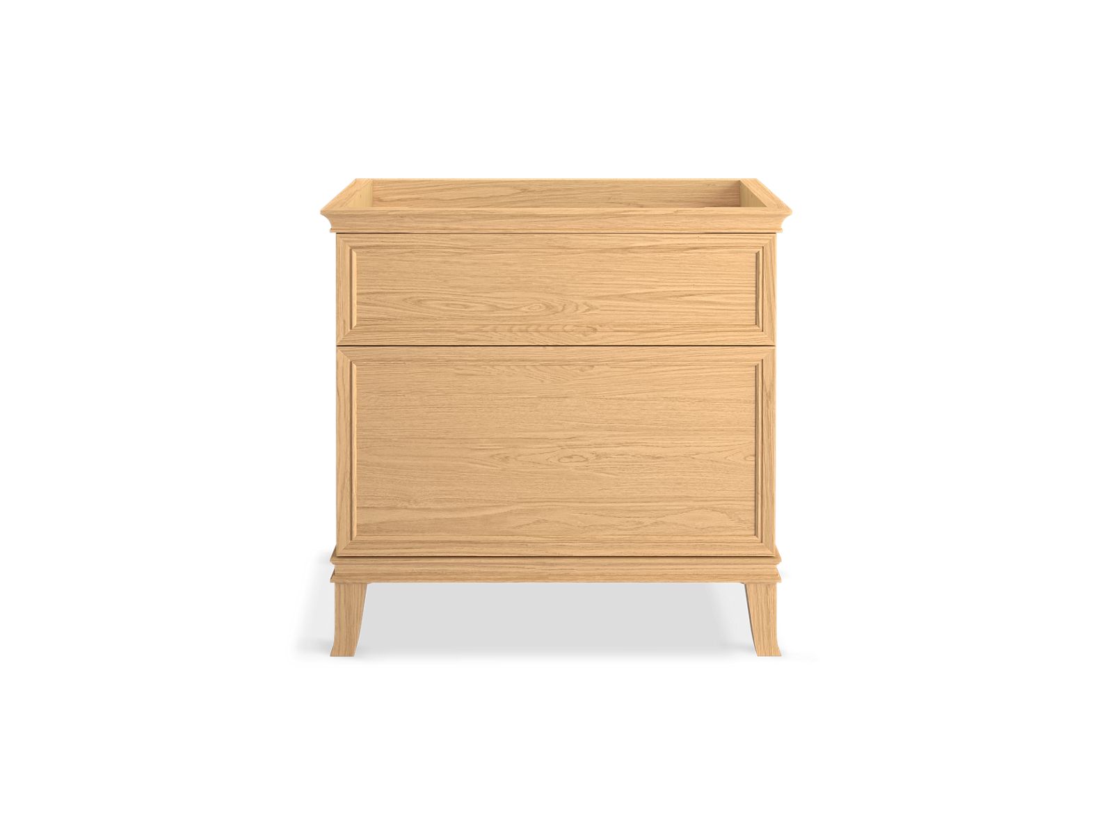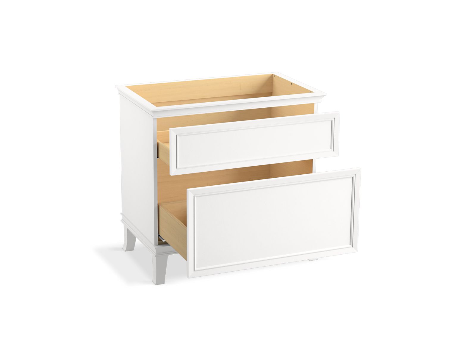 Elegant minimalist design meets midcentury traditional influence and Kohler craftsmanship in the Artifacts bathroom vanity. This simply ornamented, all-drawer cabinet features cornice molding, reminiscent of an American Federal-style bookcase, while flared solid-wood legs inspired by early nineteenth-century linen presses elevate the vanity’s style and off-floor functionality. Customize your bathroom centerpiece with a coordinating quartz top, contrasting industrial-style drawer pulls, and organizational in-drawer accessories (sold separately)—for a look that fits your aesthetic and space.