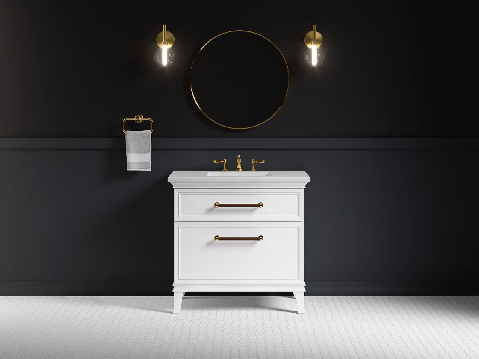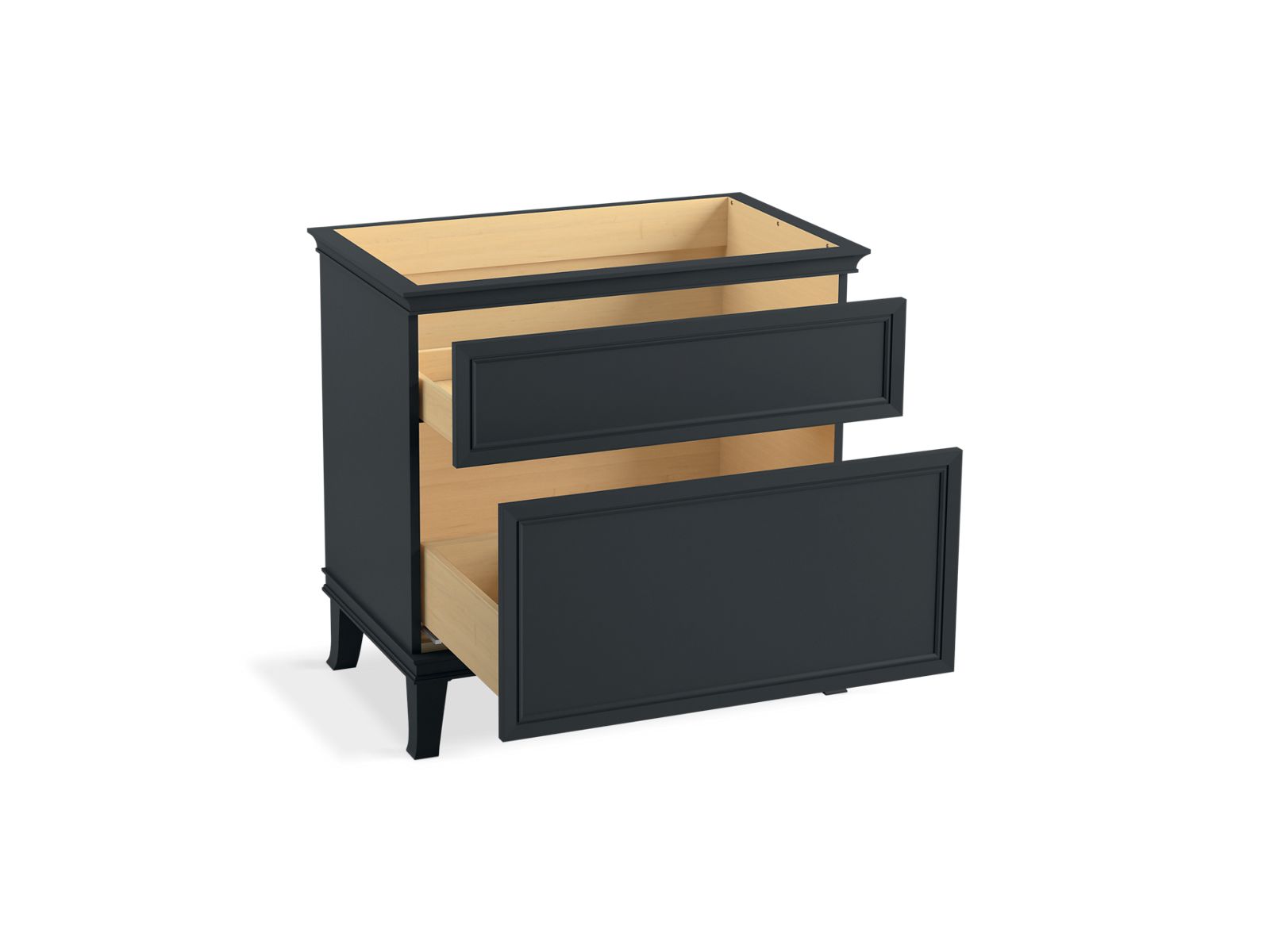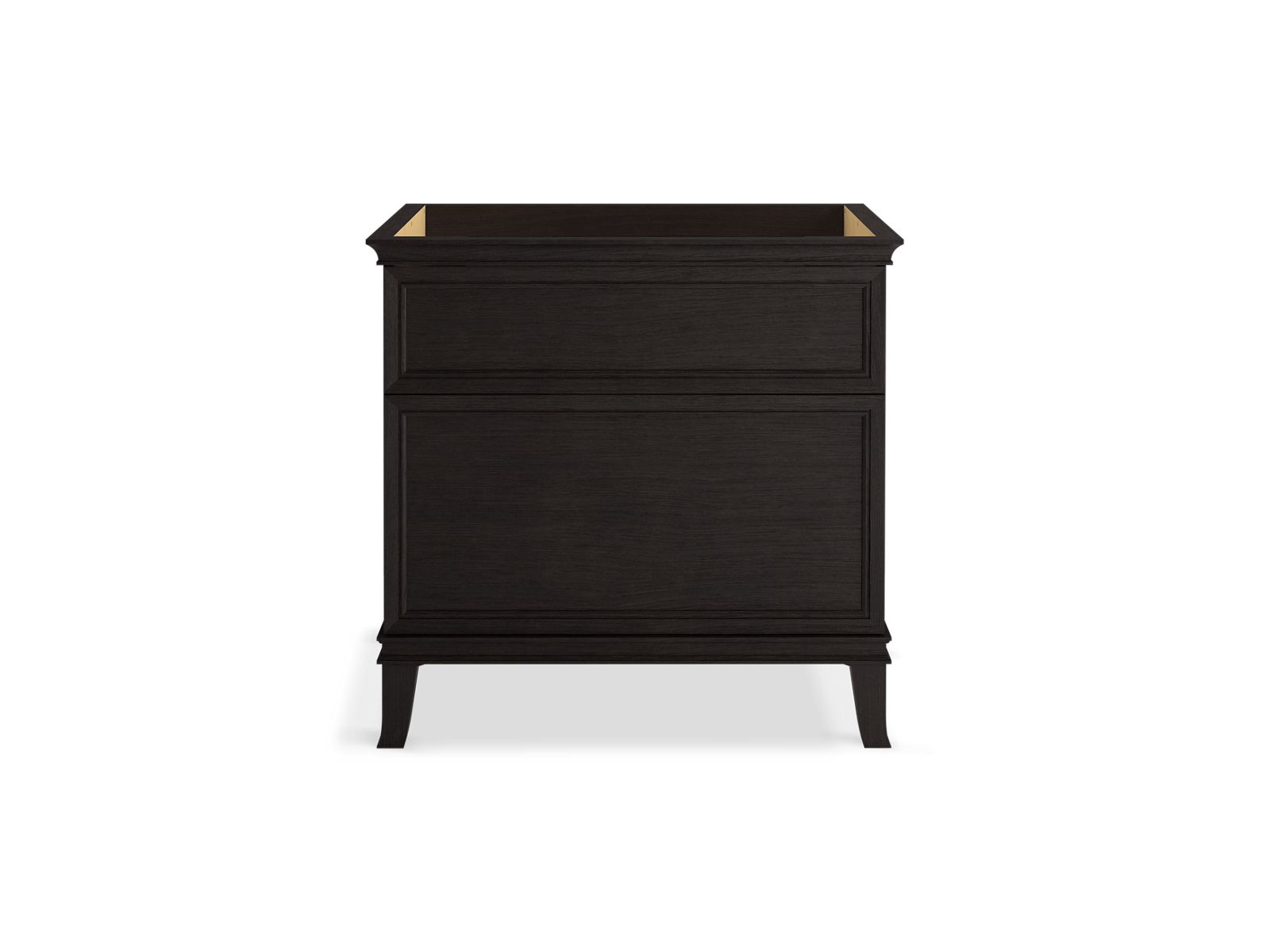 Elegant minimalist design meets midcentury traditional influence and Kohler craftsmanship in the Artifacts bathroom vanity. This simply ornamented, all-drawer cabinet features cornice molding, reminiscent of an American Federal-style bookcase, while flared solid-wood legs inspired by early nineteenth-century linen presses elevate the vanity’s style and off-floor functionality. Customize your bathroom centerpiece with a coordinating quartz top, contrasting industrial-style drawer pulls, and organizational in-drawer accessories (sold separately)—for a look that fits your aesthetic and space.