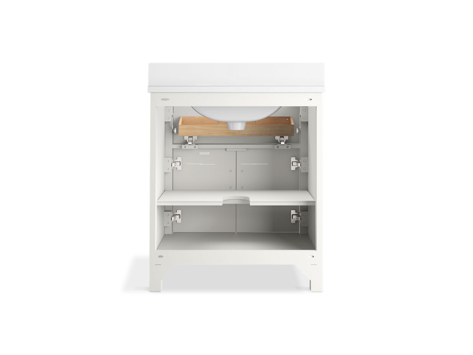 The Kresla vanity collection brings a quiet sophistication into your bathroom space with its with clean, architectural lines and range of finishes, and with its roomy interior, you'll find ample storage space to keep your bathroom organized and clutter-free. The Kresla 30" vanity set includes cabinet, quartz countertop with matching backsplash, sink, and hardware. With KOHLER®, it’s easy to find the design solution that’s right for you.