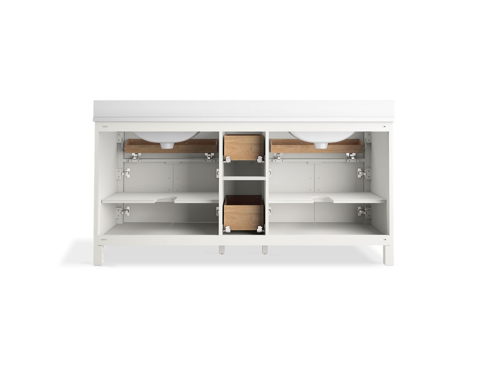 - Convenient tilt-down drawer under each basin for storing smaller, frequently-used items
