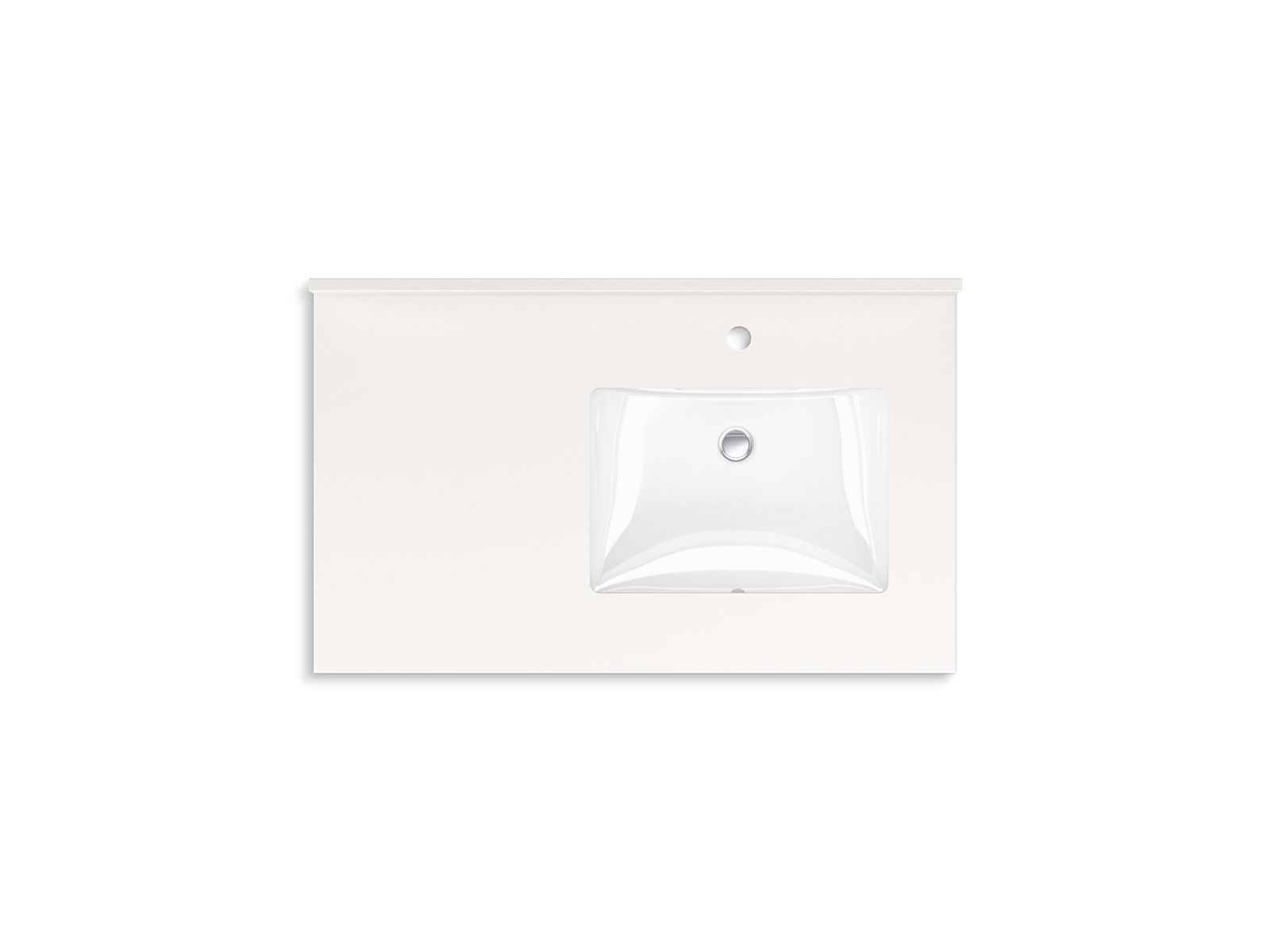 - Vanity top has single faucet hole with pilot holes for optional 8" (203 mm) widespread faucet configuration
