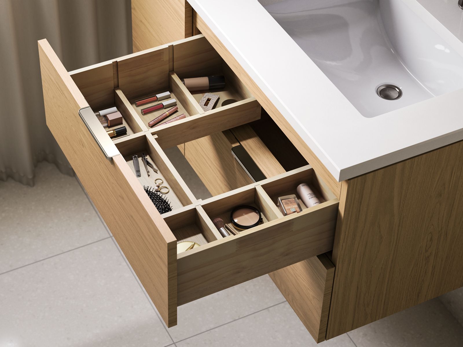 - Polished Chrome hardware included on White vanities and Brushed Nickel hardware on Light Oak vanities
