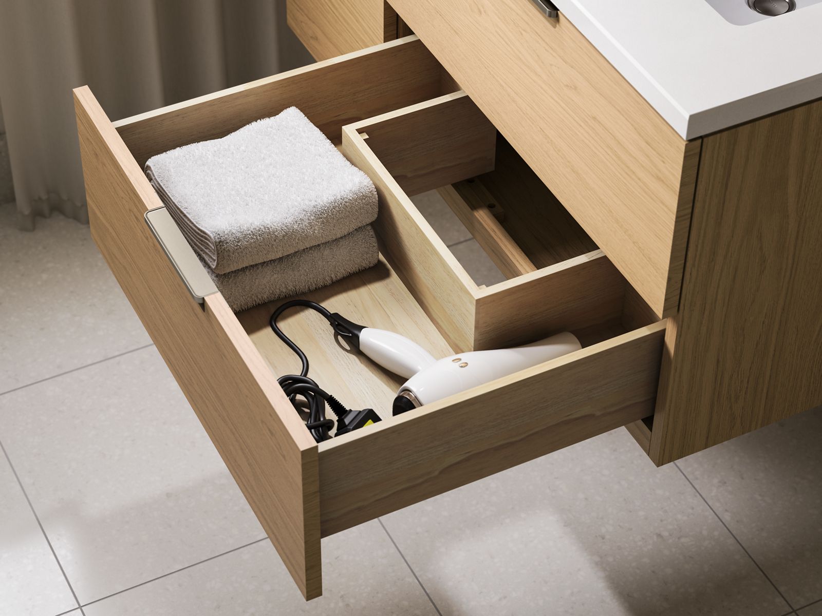 - Full-extension 15" (382 mm) upper drawer with soft-close undermount slides