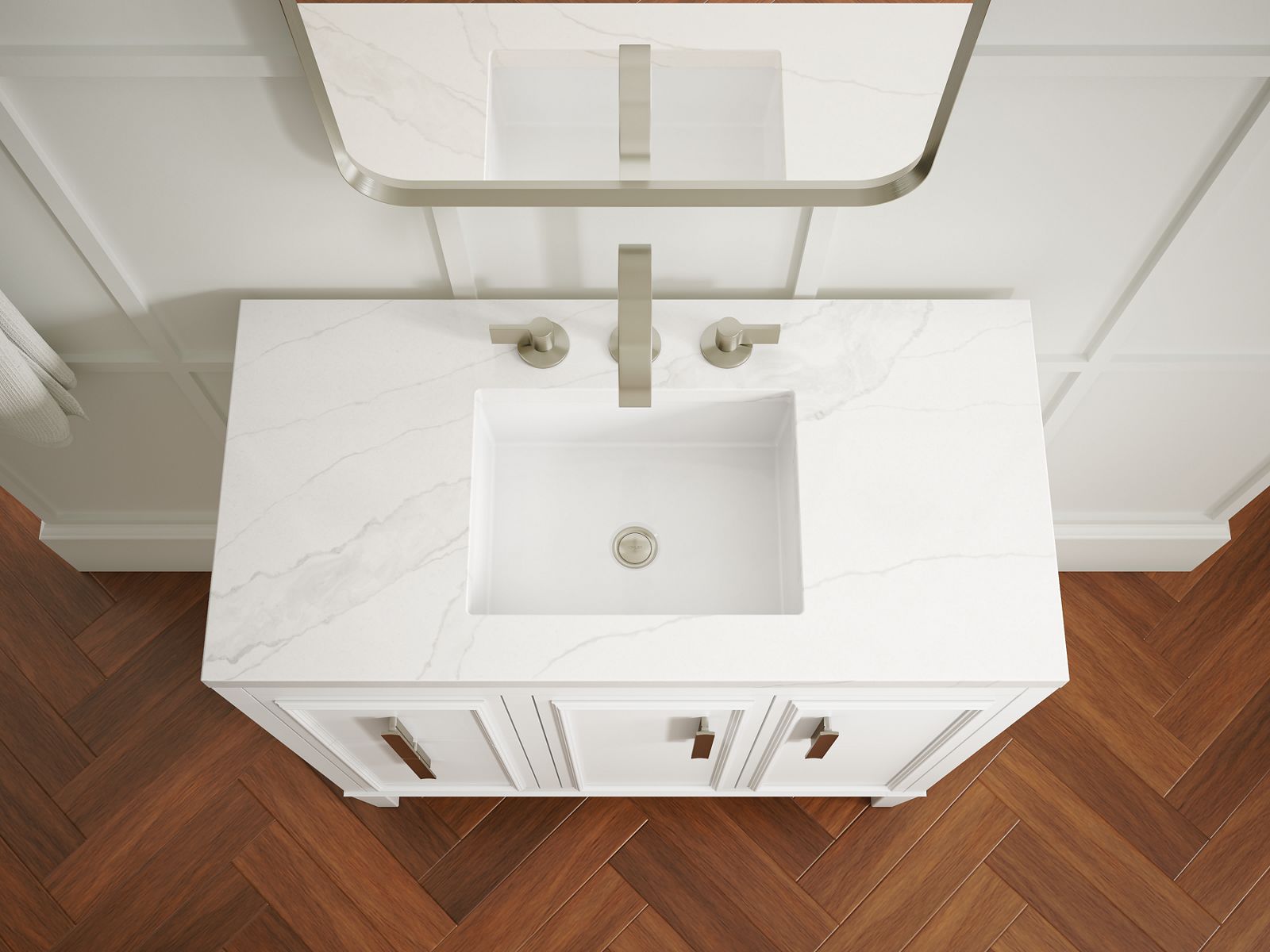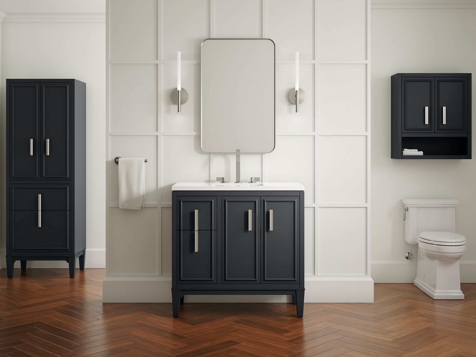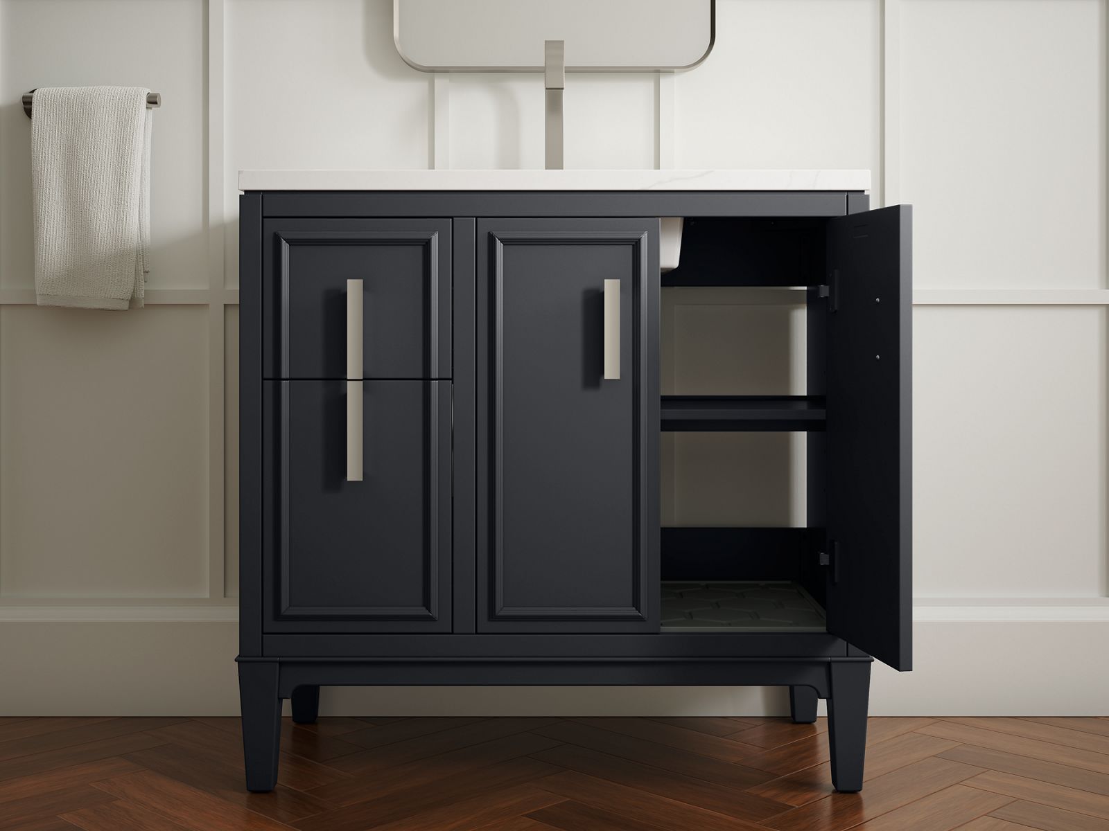Elegant and mysterious, Southerk bathroom vanities evoke contemporary class with a nod to the traditional for an aesthetic that suits any style. Frame-like molding on drawer- and door-front panels tease hidden storage entrances, further adorned with elongated decorative handles that align to form a single design element on stacked drawers. Make your everyday vanity uniquely yours with choice of color. Cabinet, countertop, sink, legs, and Vibrant® Brushed Nickel hardware are included with the vanity set, which is ready to self-install during your next bathroom update. Additional hardware finishes are also available.