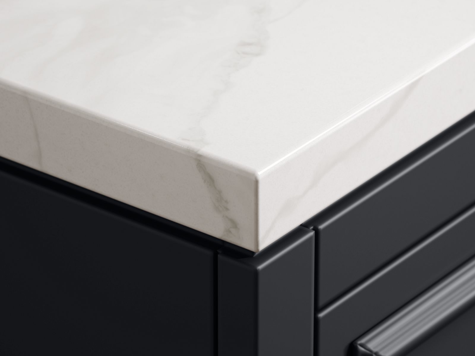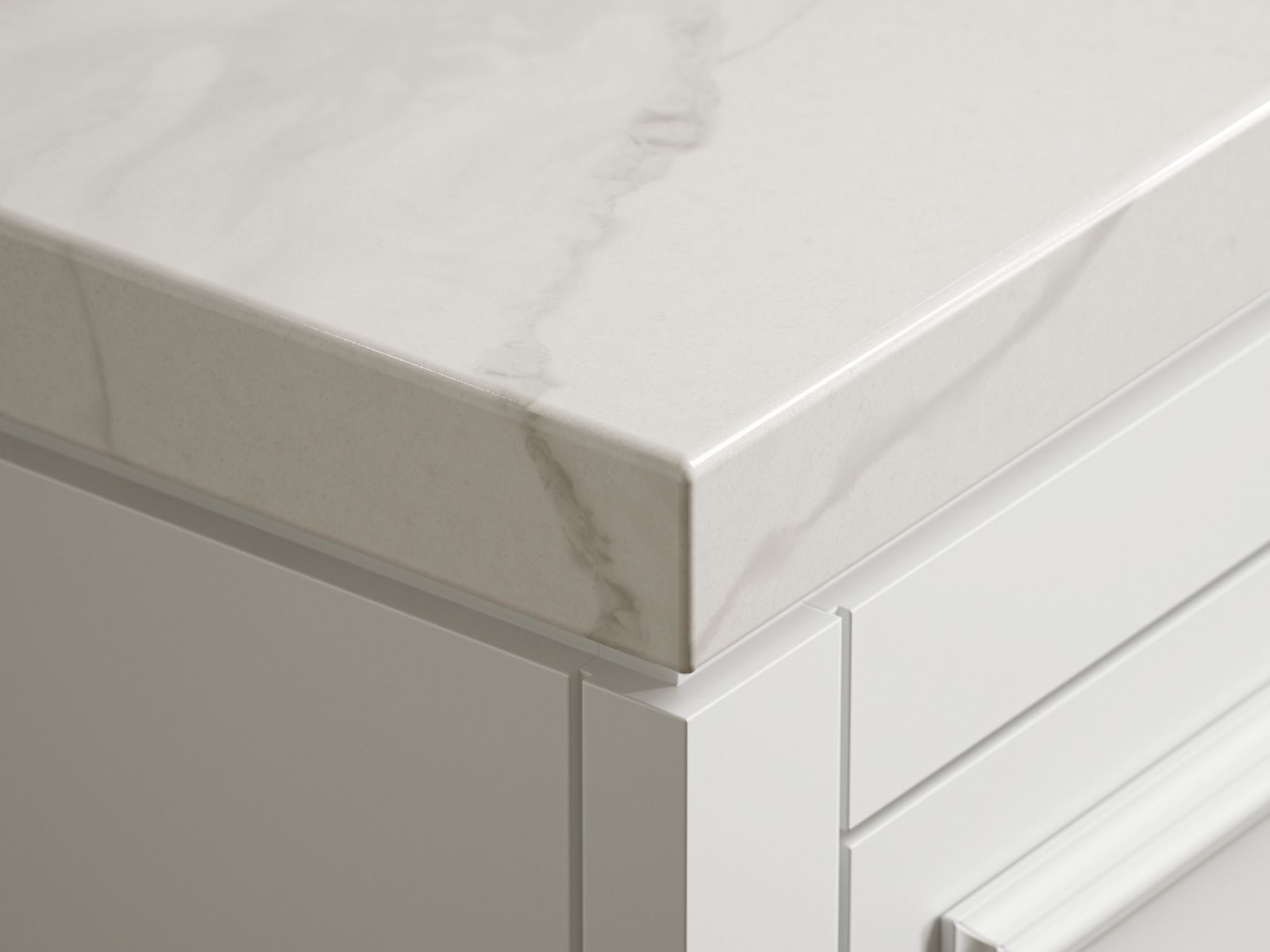 Elegant and mysterious, Southerk bathroom vanities evoke contemporary class with a nod to the traditional for an aesthetic that suits any style. Frame-like molding on drawer- and door-front panels tease hidden storage entrances, further adorned with elongated decorative handles that align to form a single design element on stacked drawers. Make your everyday vanity uniquely yours with choice of color. Cabinet, countertop, sinks, legs, and Vibrant® Brushed Nickel hardware are included with the vanity set, which is ready to self-install during your next bathroom update. Additional hardware finishes are also available.