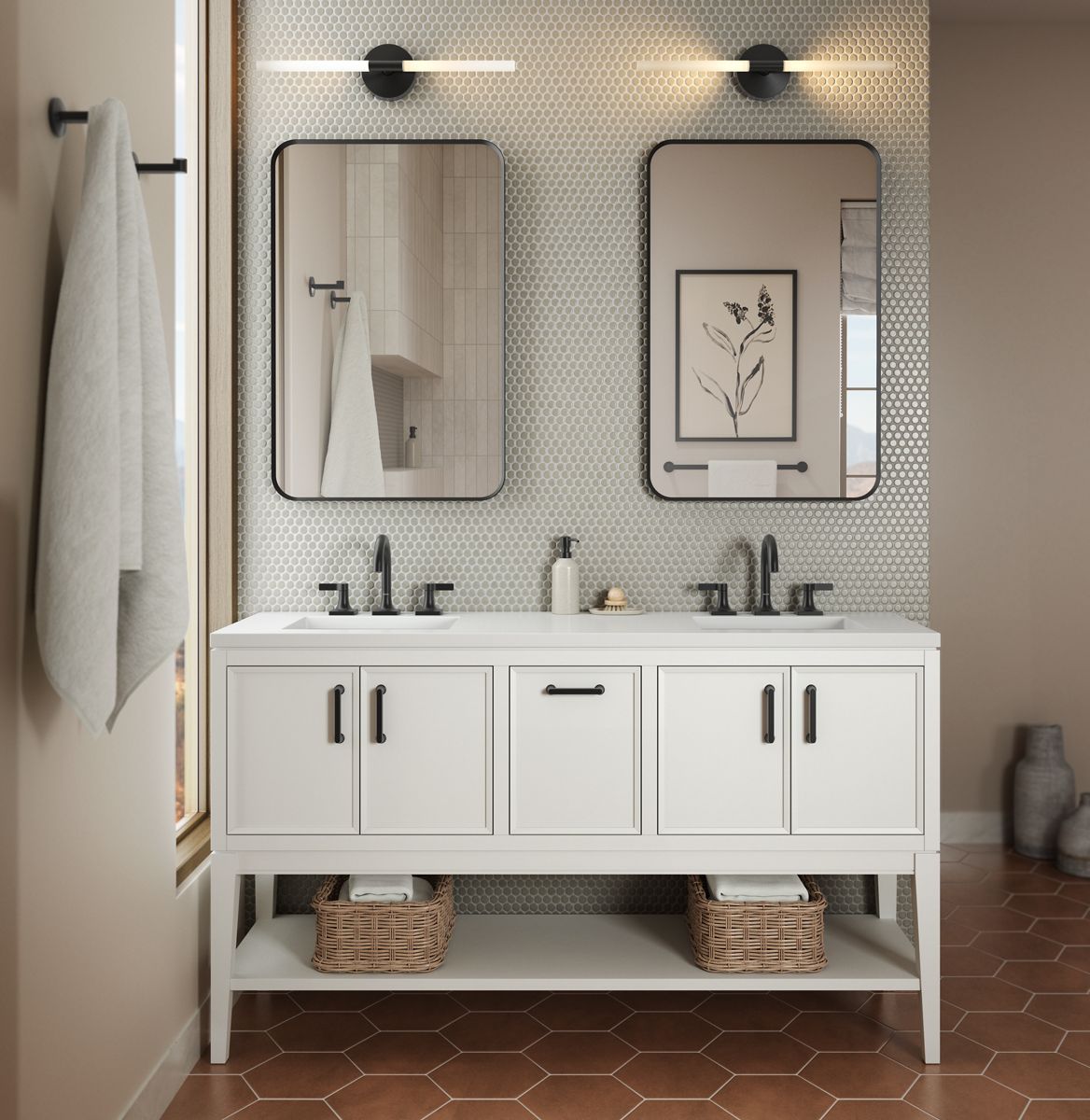 Timeless, simplistic pieces updated for the modern home, Winnow bathroom cabinets are at once familiar and different. Optional tall, tapered legs and symmetrical design are recognizably Shaker, while beveled door and drawer fronts and hardware with rounded corners deliver fresh details. The perfect balance of classic, elegant, and versatile, Winnow vanities come to life when you select your cabinet color. Cabinet, countertop, sinks, legs, shelf, and Vibrant® Brushed Nickel hardware are included with the set, which is ready for self-assembly on legs. Additional hardware finishes are also available.